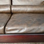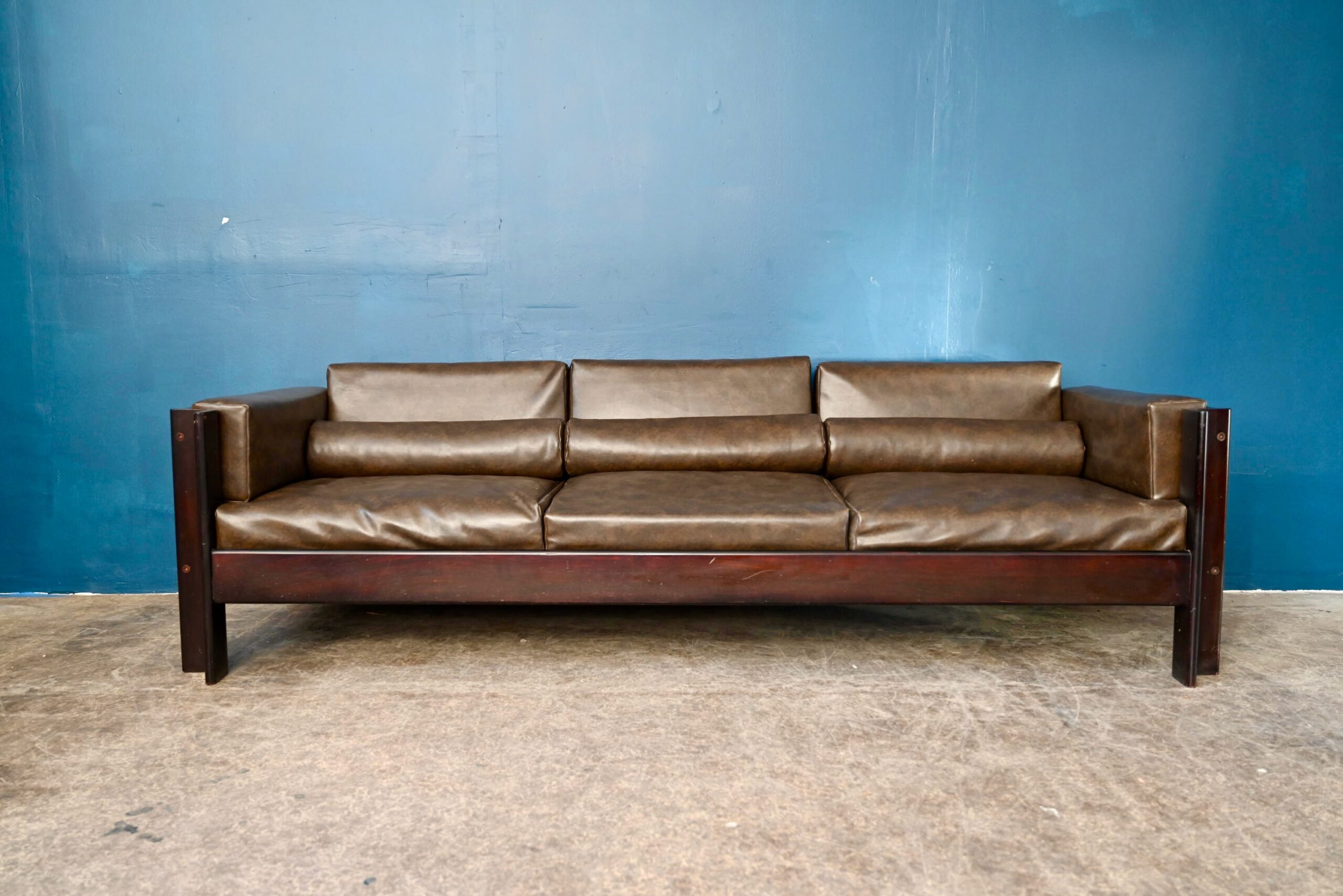 La canapé 3 places est ancien et date des années 60. Il a été dessiné par Sergio Asti pour Poltronova et appartient à la collection “Zelda”. La structure est en bois thermoformé à la teinte profonde soutenu par des coussins en marron glacé. Le confort est optimal, ferme et accueillant à la fois. Des coussins cale-reins amovibles ajoutent au confort. Des traces d’usages sont visibles en photo : un très petit accroc sur le skaï, quelques traces d’usage sur le vinyle. Le dos du canapé est superbe, très graphique, permettant de placer le canapé en centre de pièce. Le mobilier de la gamme Zelda par Poltronova n’est plus produit actuellement. Cette version est très peu courante.
