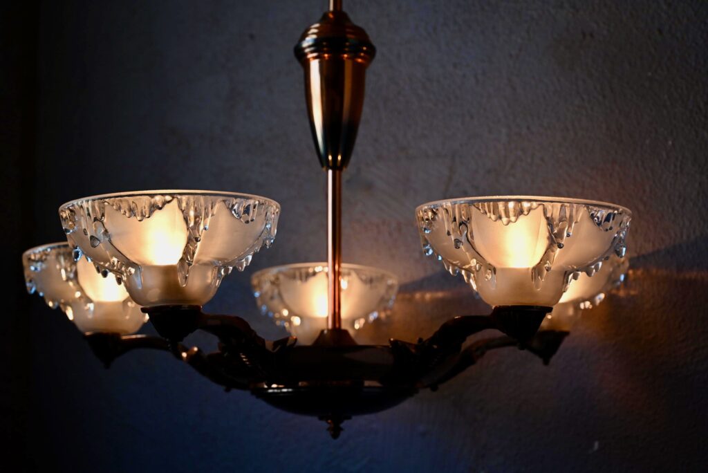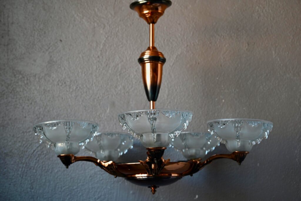 Le luminaire Art Déco est ancien, il est doté de 5 feux. Il est en métal, aux reflets cuivrés et métalliques, portant des éléments en verre moulé. Quelques traces d’usage sont visibles à la surface du métal. L’électricité d’origine est fonctionnelle.