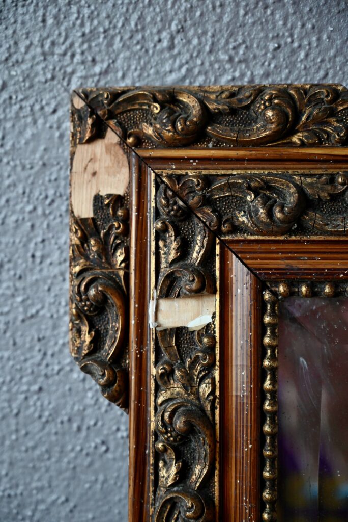Le miroir est ancien, de très belle facture. Le tain est marqué par le temps : taches et points noirées y sont visibles. Des manques sont à noter sur le décor du cadre. Seul ou en collection, ce joli miroir ancien sera une belle pièce déco.