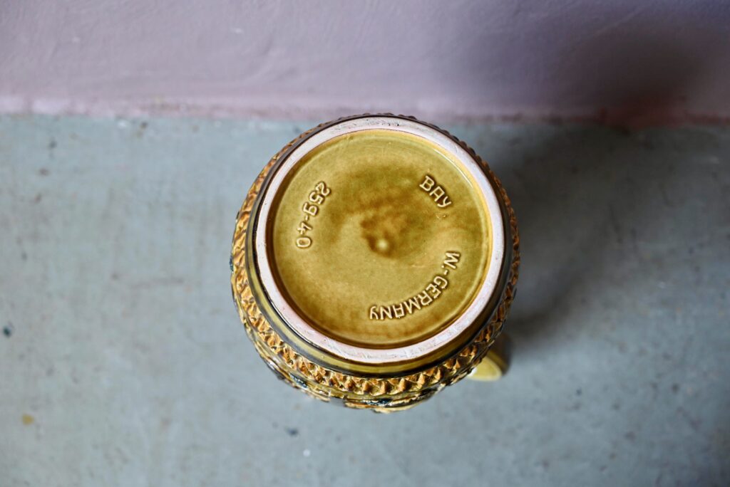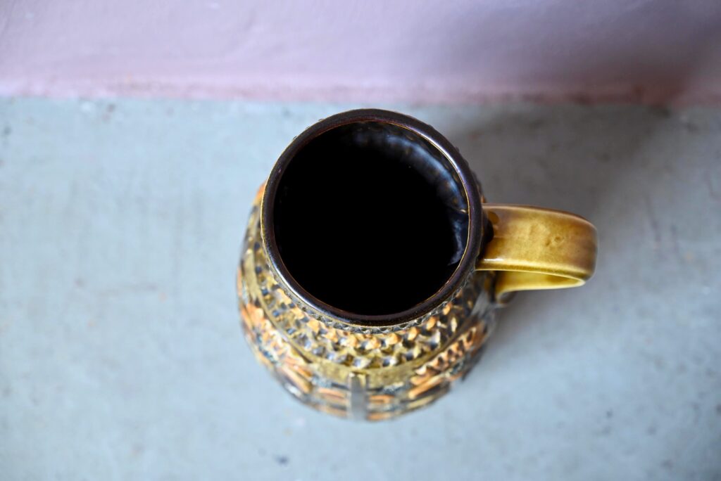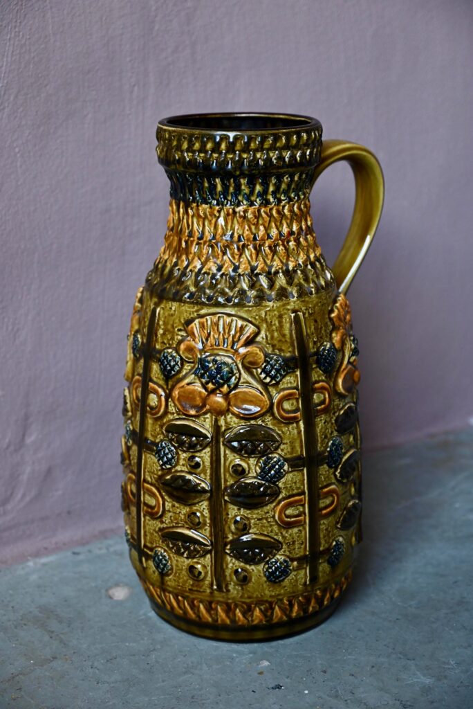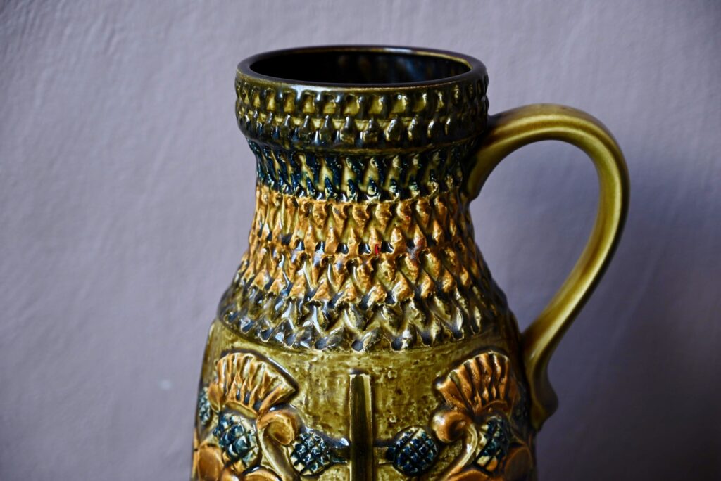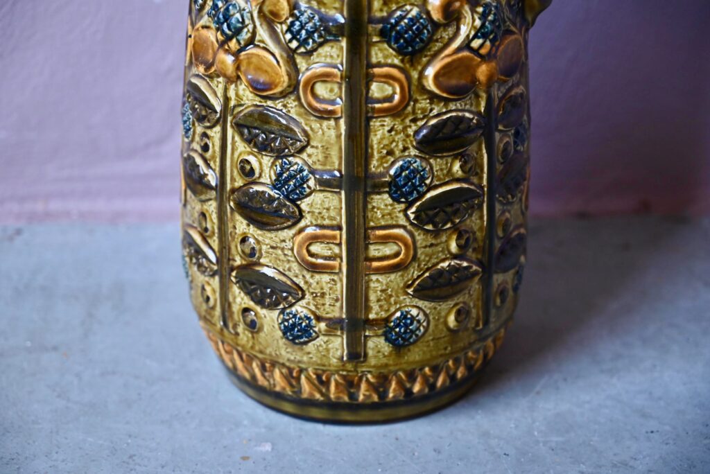 Bay Keramik fait partie des fabriques de céramique réputées pour la production de vases colorés aux émaux épais dans l’esprit Fat Lava. Ce grand vase à anse est doté d’un émaillage épais et est orné de motifs floraux stylisés en relief. Nous aimons son pouvoir décoratif! Seul ou en collection, il saura apporter sa touche déco et mettre en valeur un joli meuble vintage.