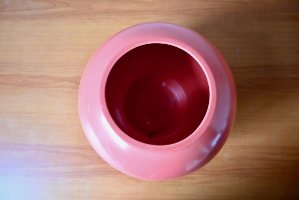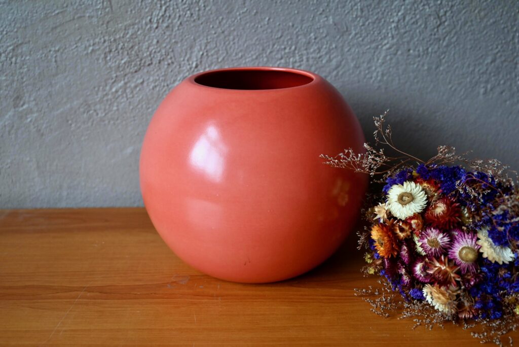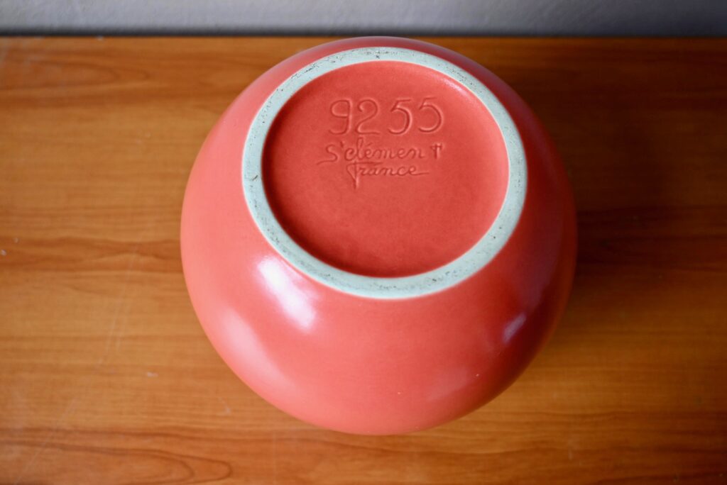 Ce vase provient de la faïencerie « Saint Clément » de Lunéville en Lorraine, dont la production du milieu du 20ème siècle est aussi surprenante dans l’audace des formes que dans l’usage de couleurs vives et contrastées. Dans un style art déco, il allie une couleur orange pleine de fraicheur et une forme boule d’une grande générosité.