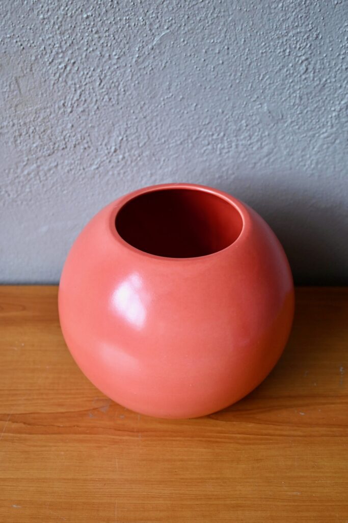 Le vase boule en céramique est en parfait état, signature, numéro et logo Saint Clément à la base. La couleur orange mat de la couverte en fait une pièce originale et imposante.
