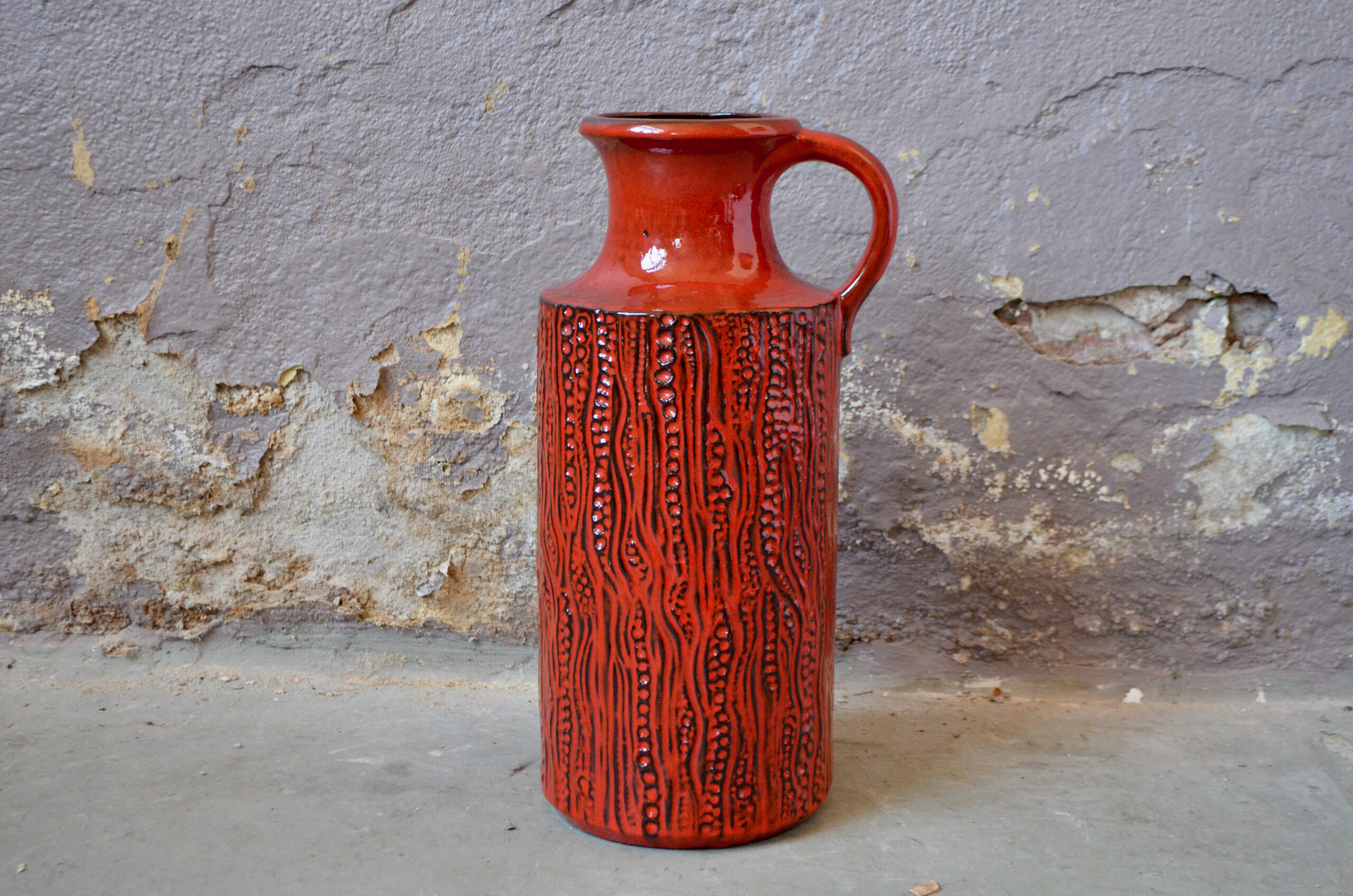 La production de faïence en Allemagne des années 60 et 70 est impressionnante. Il semble que les potiers rivalisent d’imagination pour proposer des pièces aux formes et couleurs aussi diverses qu’audacieuses. Ce grand vase rouge signé “Carstens Tonnieshof” ne déroge pas à la règle avec son épais émaillage décoré de scarifications verticales. C’est une évocation d’ornementions tribales ou ethniques. Sa belle forme et son aspect original seront en valeur sur une jolie enfilade, au sol ou sur une étagère scandinave !
