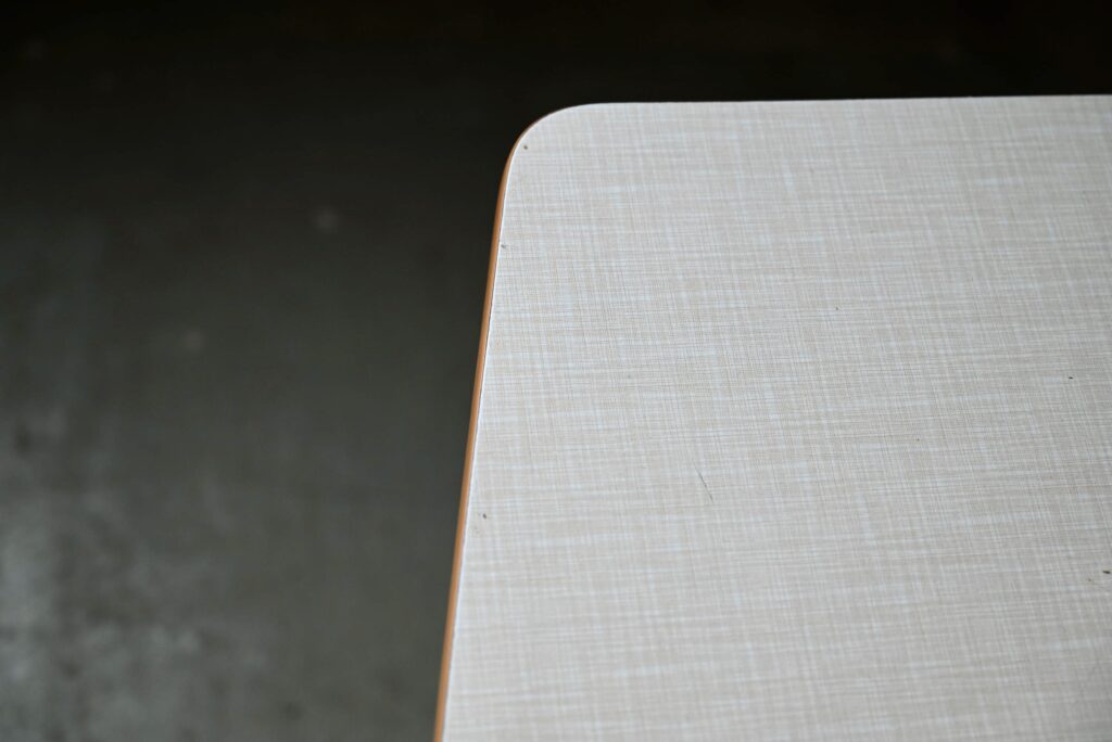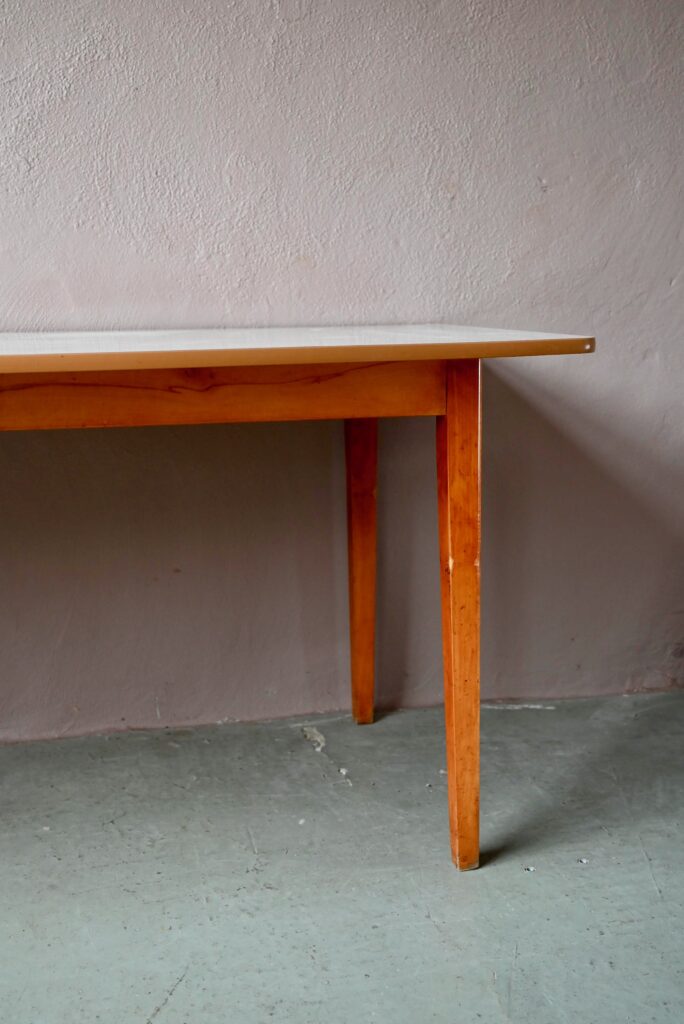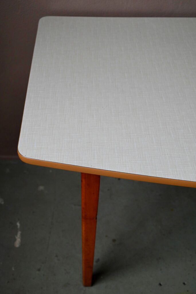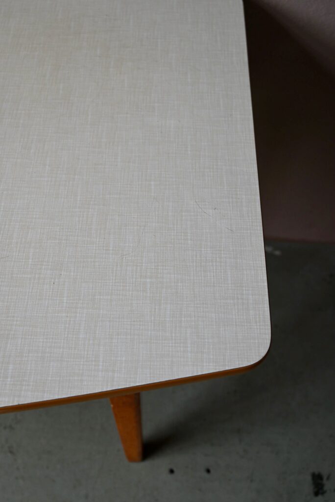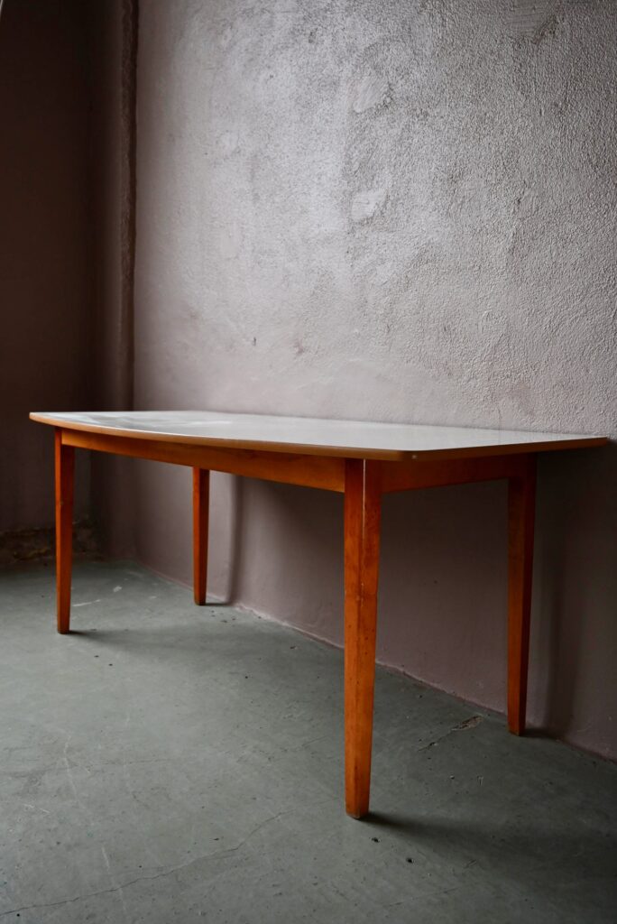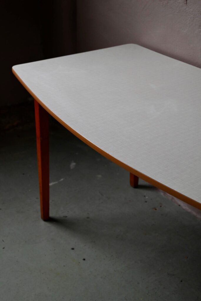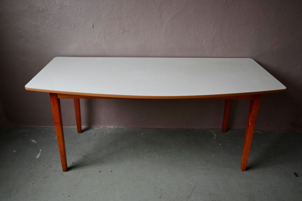 La table date des années 50 et présente une belle patine sur le piétement en bois massif, et des traces d’usage quelques traces d’usage discrètes sur le plateau. Elle est grande et arrondie sur un côté, pouvant faire office de table à manger ou de table d’atelier. Le plateau est en formica blanc chiné, le chant est en vinyle beige. Le piétement est en bois, d’une belle teinte dorée et patinée. Parfaitement stable, en bel état, de belles dimensions et originale, cette table est une très belle pièce rétro.