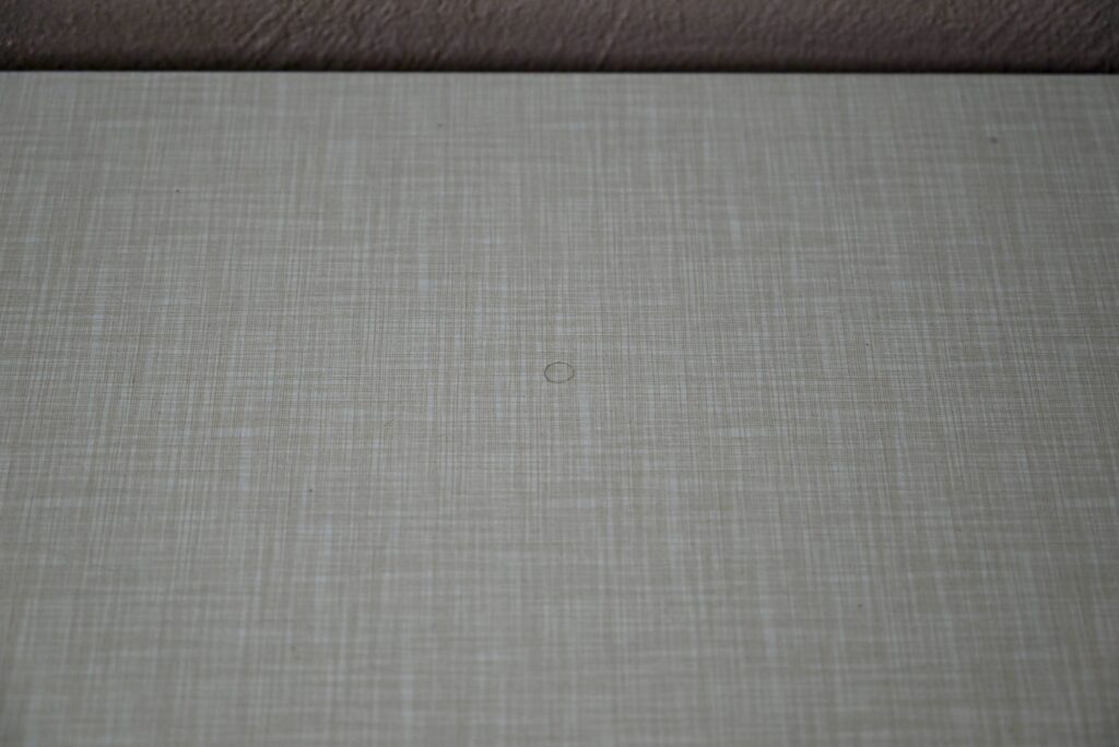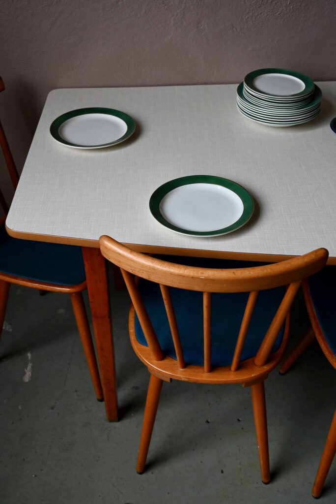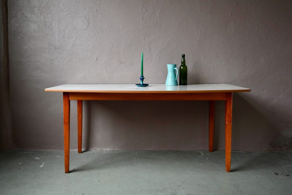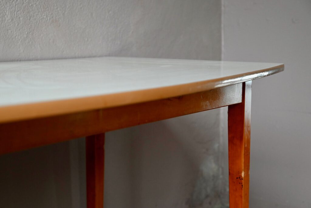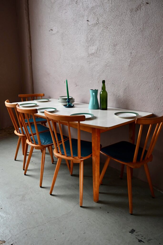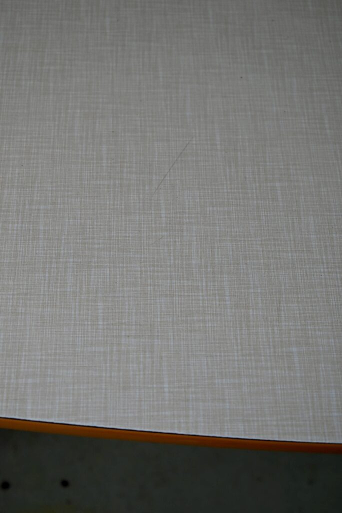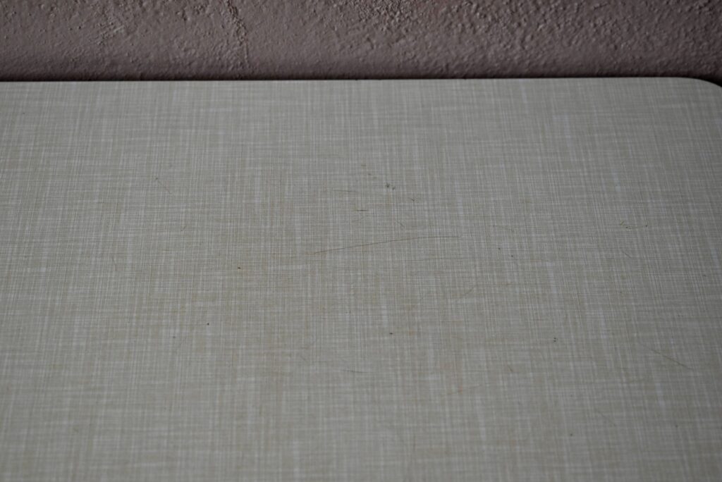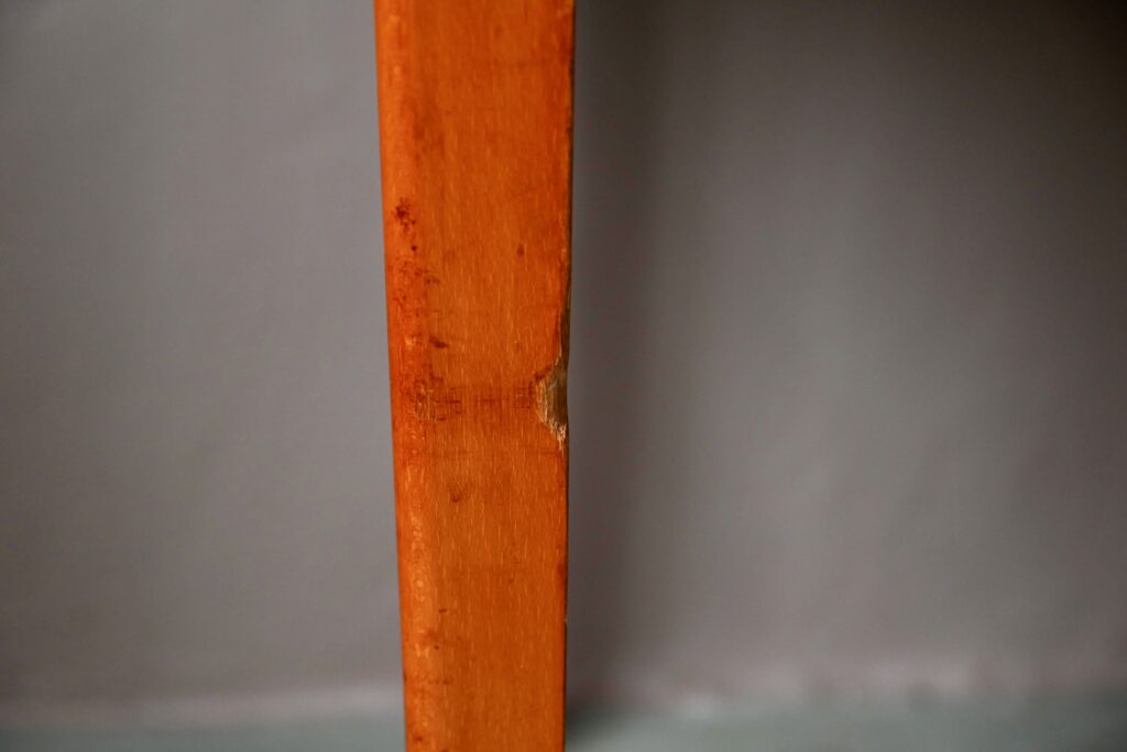 La table date des années 50 et présente une belle patine sur le piétement en bois massif, et des traces d’usage quelques traces d’usage discrètes sur le plateau. Elle est grande et arrondie sur un côté, pouvant faire office de table à manger ou de table d’atelier. Le plateau est en formica blanc chiné, le chant est en vinyle beige. Le piétement est en bois, d’une belle teinte dorée et patinée. Parfaitement stable, en bel état, de belles dimensions et originale, cette table est une très belle pièce rétro.
