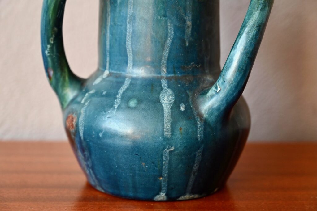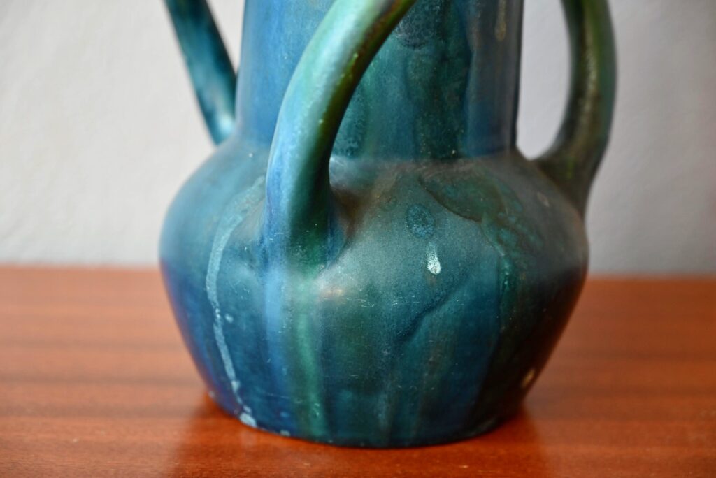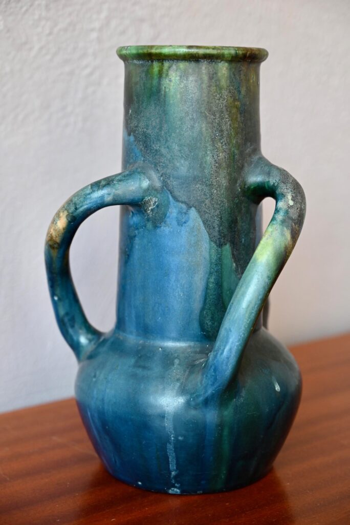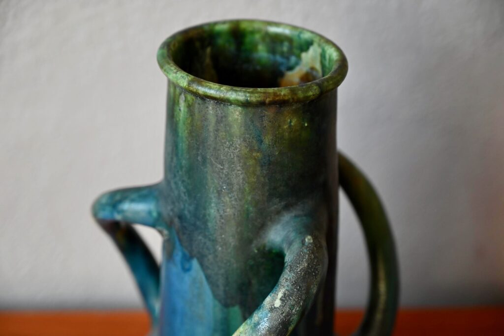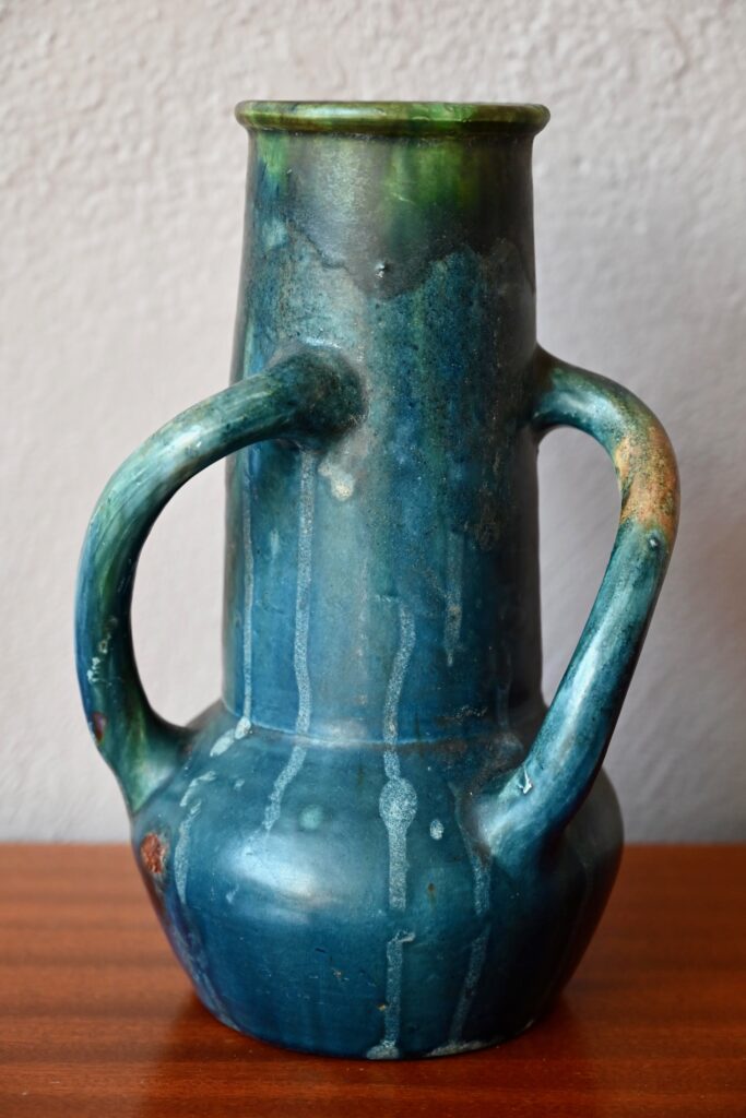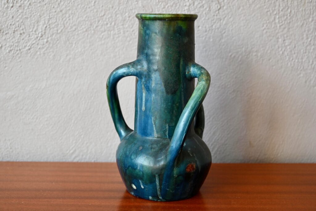 Ce grand vase est une production Art Nouveau Charles MAES à Sint-Amandsberg en Belgique vers 1905 -1909. Réalisé avec aisance, il possède 3 anses tournantes autour du col allongé. La céramique est épaisse, dense. Elle est émaillée d’un bleu profond et nuancé, teinté de touches terracotta tirant sur le vert par endroit. C’est une pièce de céramique Art Nouveau marquante, à la forme originale et maîtrisée.