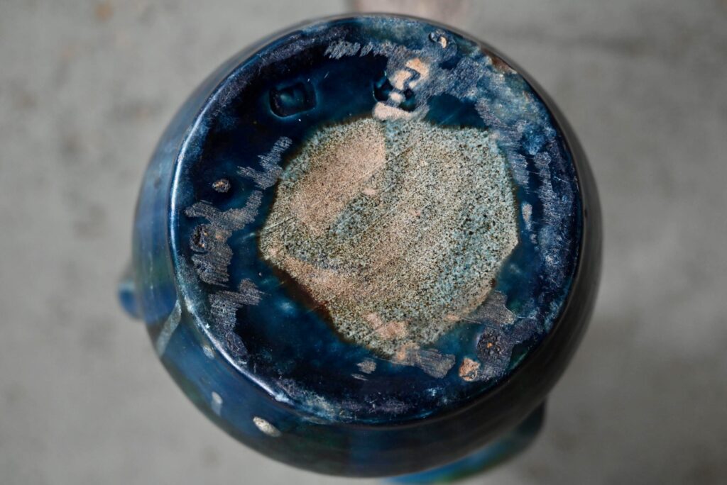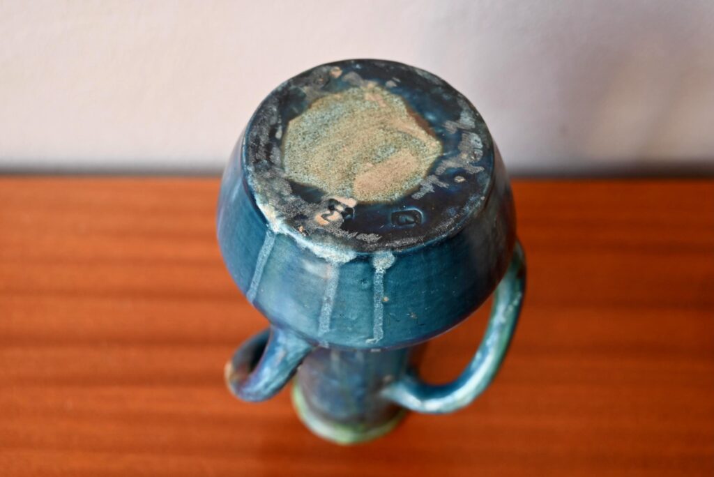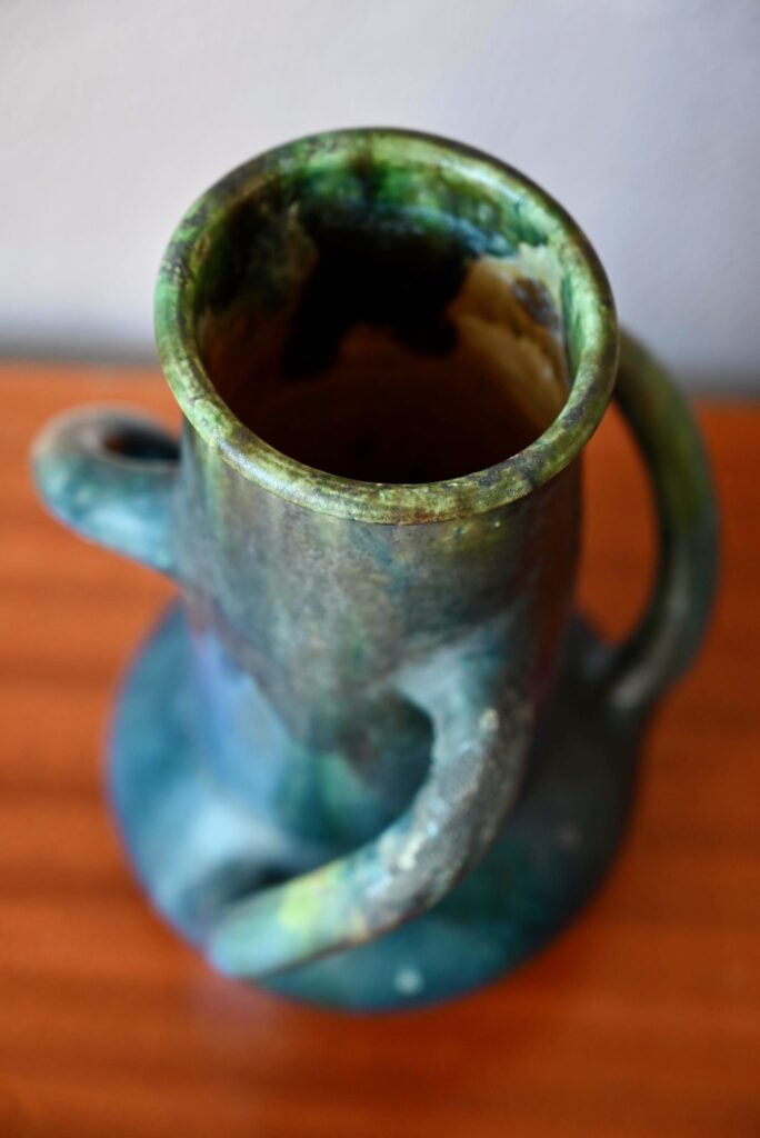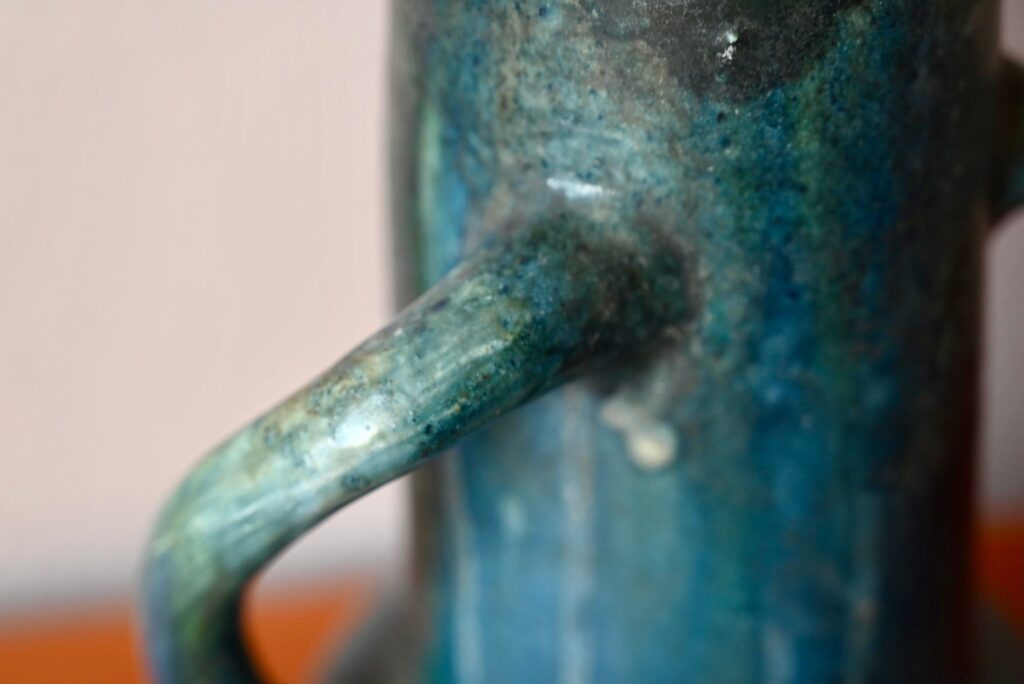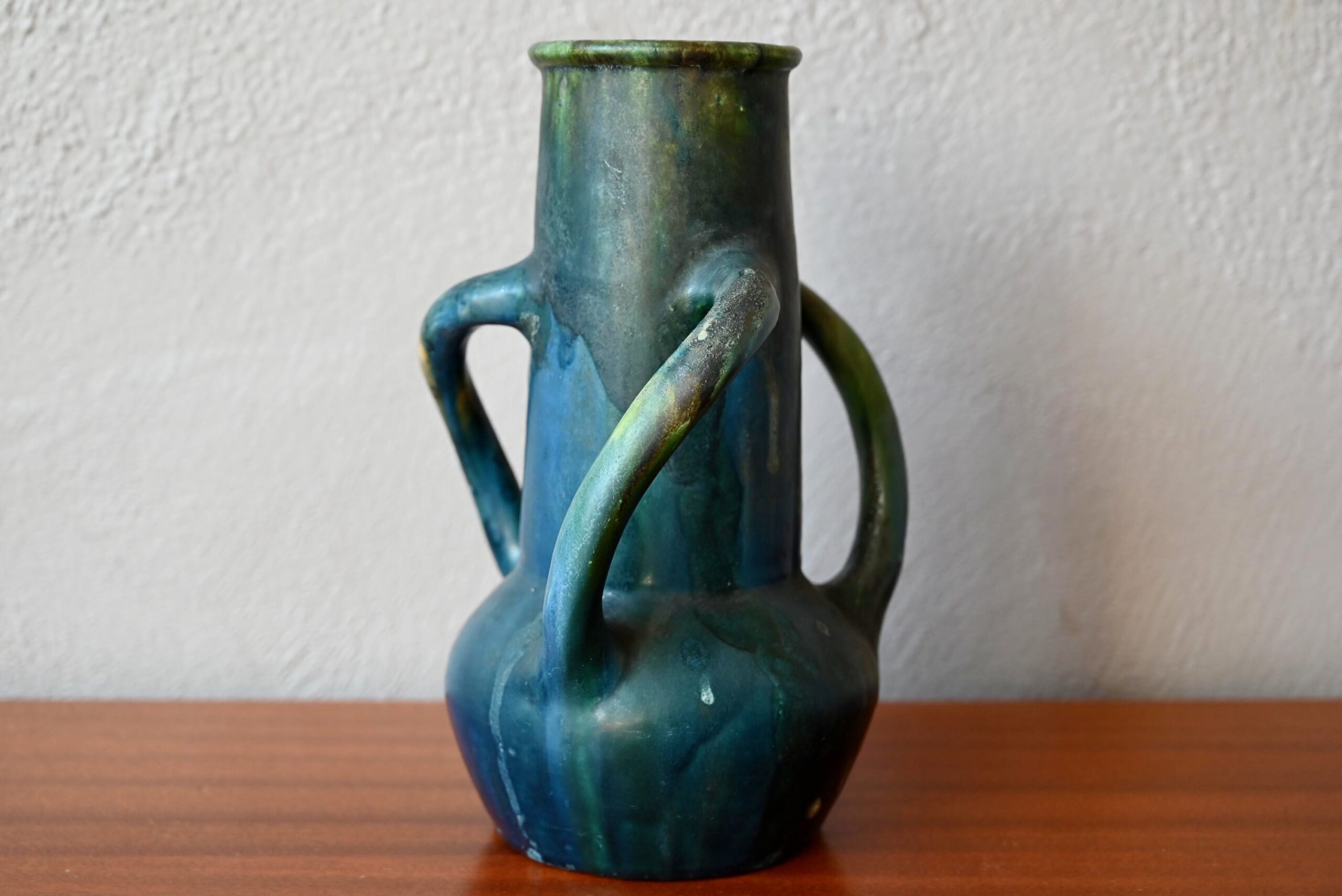 Ce grand vase est une production Art Nouveau Charles MAES à Sint-Amandsberg en Belgique vers 1905 -1909. Réalisé avec aisance, il possède 3 anses tournantes autour du col allongé. La céramique est épaisse, dense. Elle est émaillée d’un bleu profond et nuancé, teinté de touches terracotta tirant sur le vert par endroit. C’est une pièce de céramique Art Nouveau marquante, à la forme originale et maîtrisée.