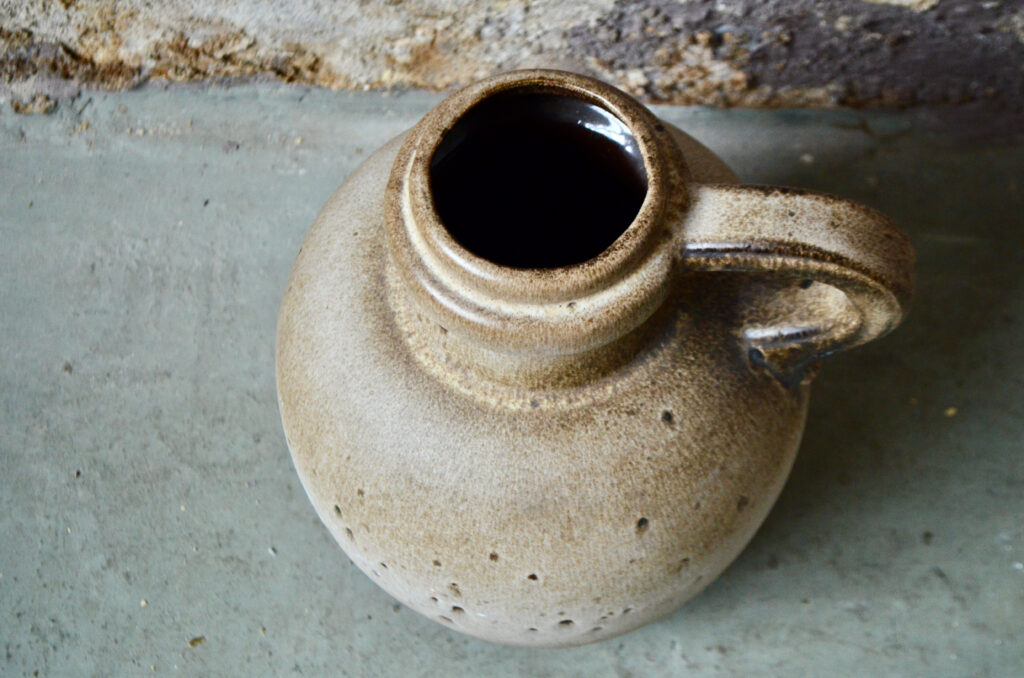 Ce grand vase allemand des années 60 prend la forme d’un pichet globuleux à l’émail tacheté et nuancé. Posé au sol ou sur un meuble de grande taille comme une enfilade en teck, cette céramique vintage apportera sa touche vintage à la décoration intérieure.