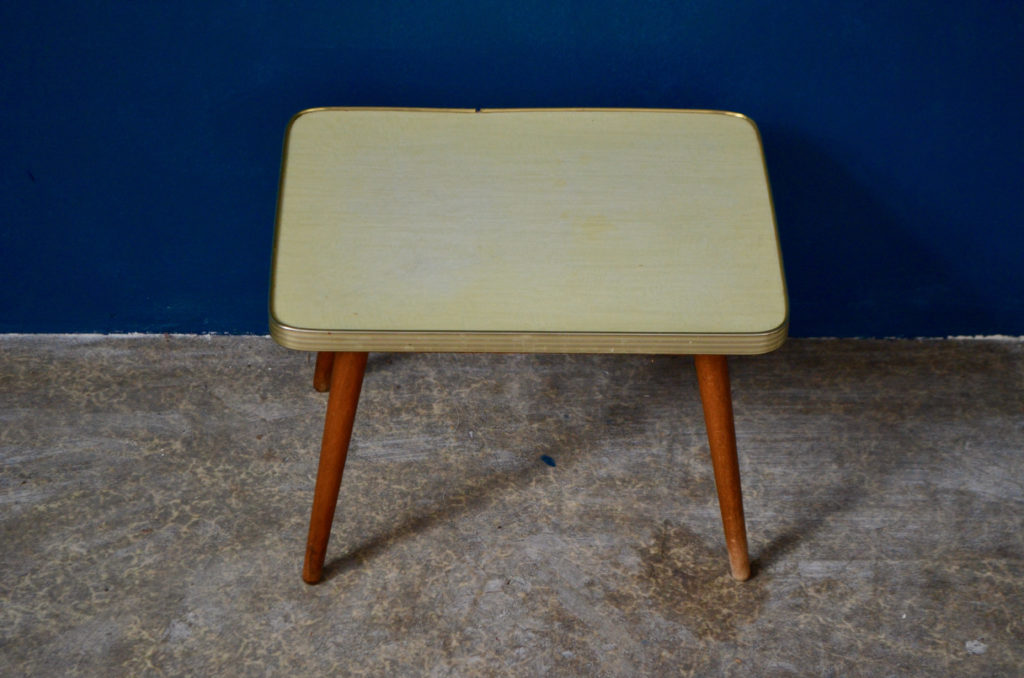 Le guéridon date des années 60. Il est de forme allongée aux angles arrondis. Le plateau est jaune clair, bordé d’un chant doré. Il est porté par un piétement compas en bois de teinte moyenne. L’ensemble est stable et en bel état. Quelques traces de frottement sont visibles sur le plateau ainsi que sur le bas du piètement.