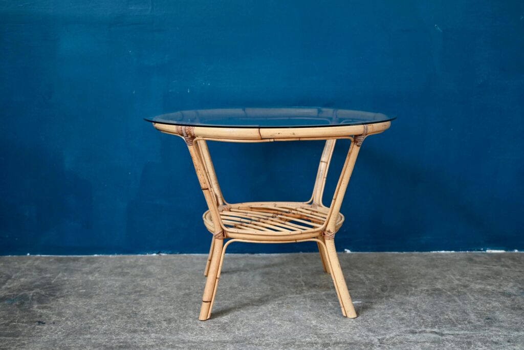La table basse est ancienne et date des années 60. Elle est en rotin et bambou, d’une teinte claire dorée. Le plateau est en verre, amovible. L’ensemble est en bon état, stable et facile à intégrer.