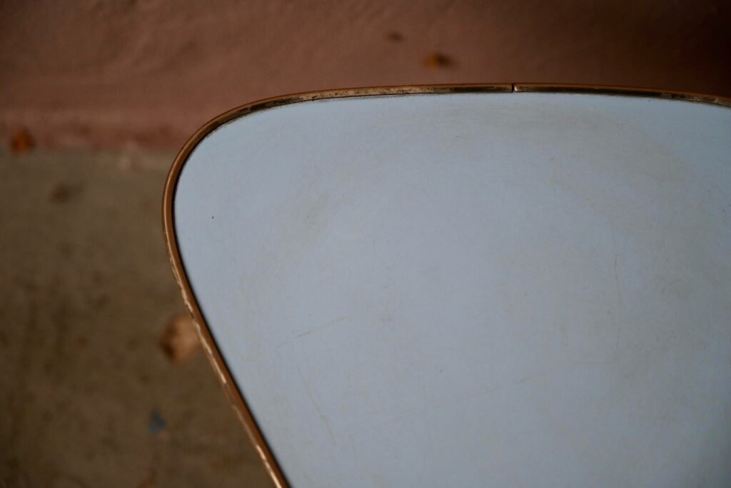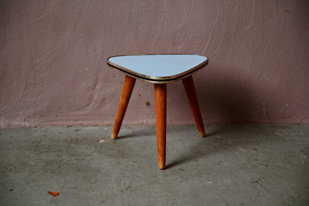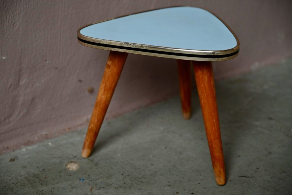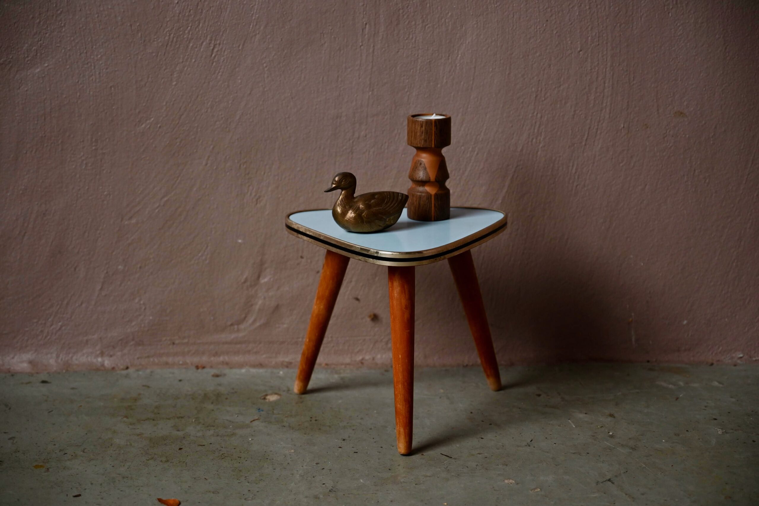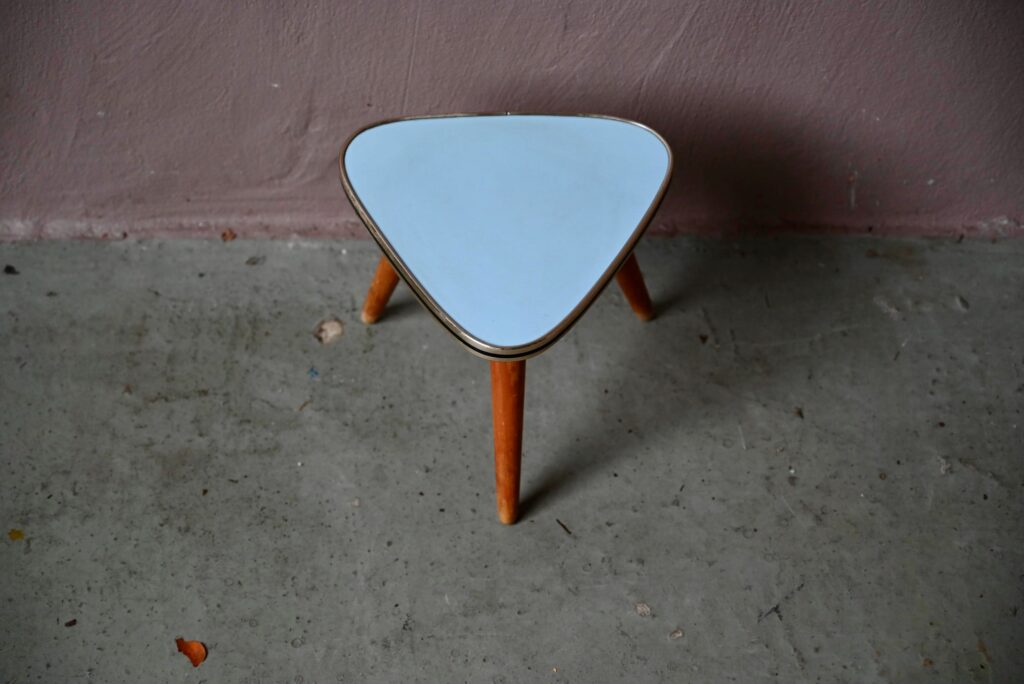 Le piétement tripode du porte-plantes est en bois massif doré et vernis. Le plateau est en formica® bleu clair et le chant doré. Des traces d’usage sont à noter sur le piétement, le chant et le formica, visibles en photo.