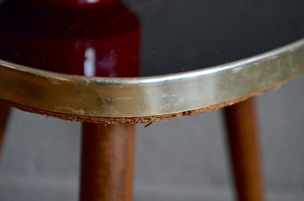 Le piétement tripode est en bois massif joliment teinté et verni. Le plateau est en verre décoré. Des traces d’usage sont visibles sur le chant, le dessous du plateau s’effrite un peu en surface.