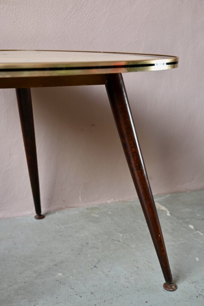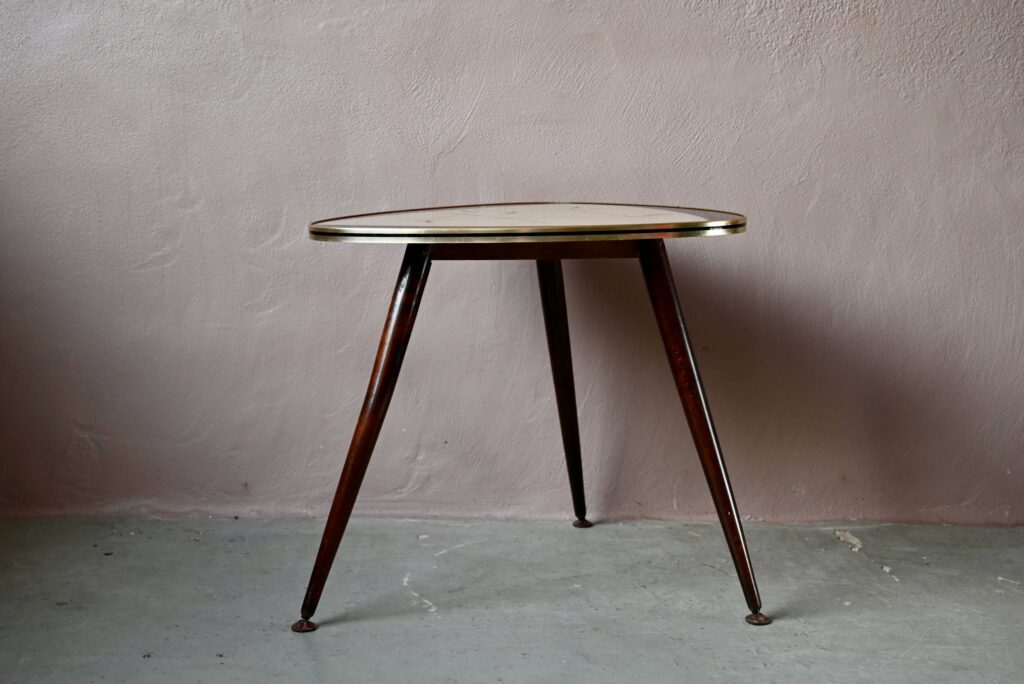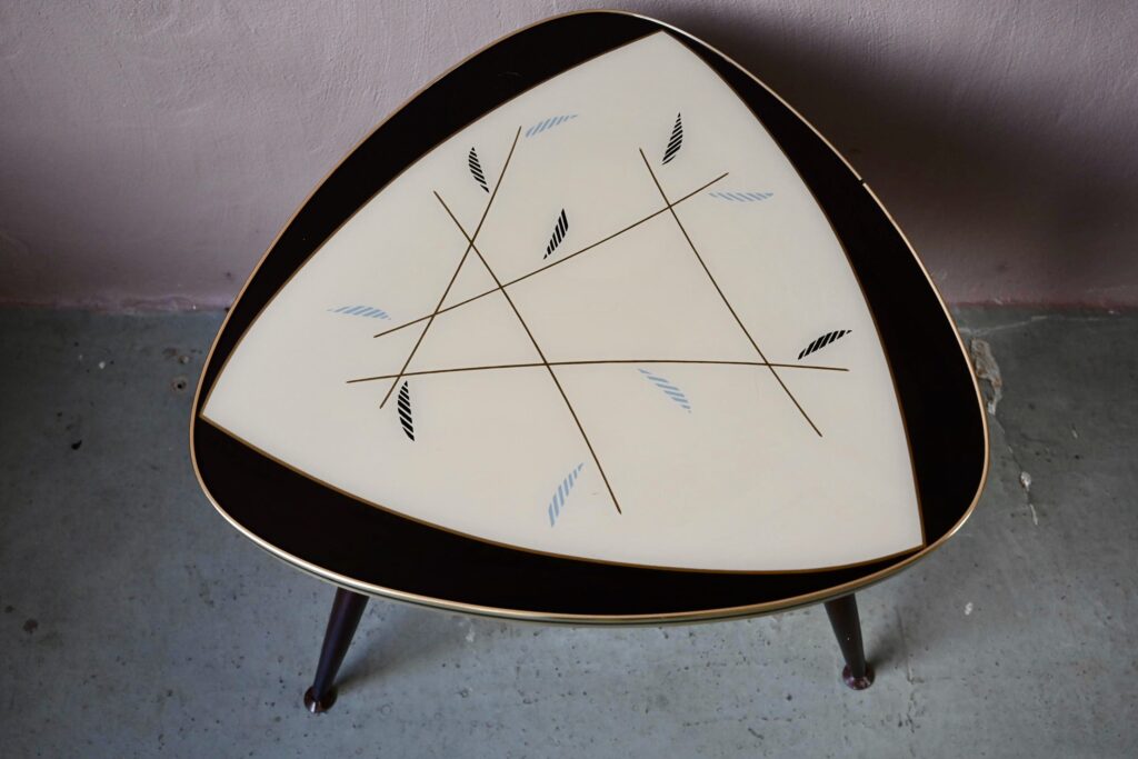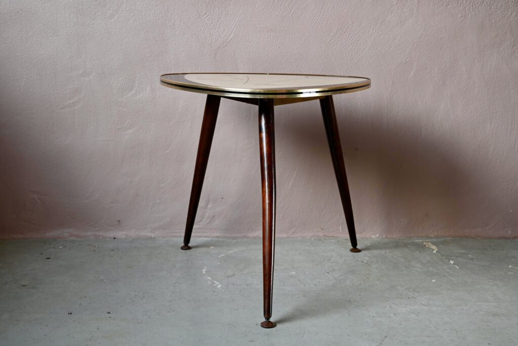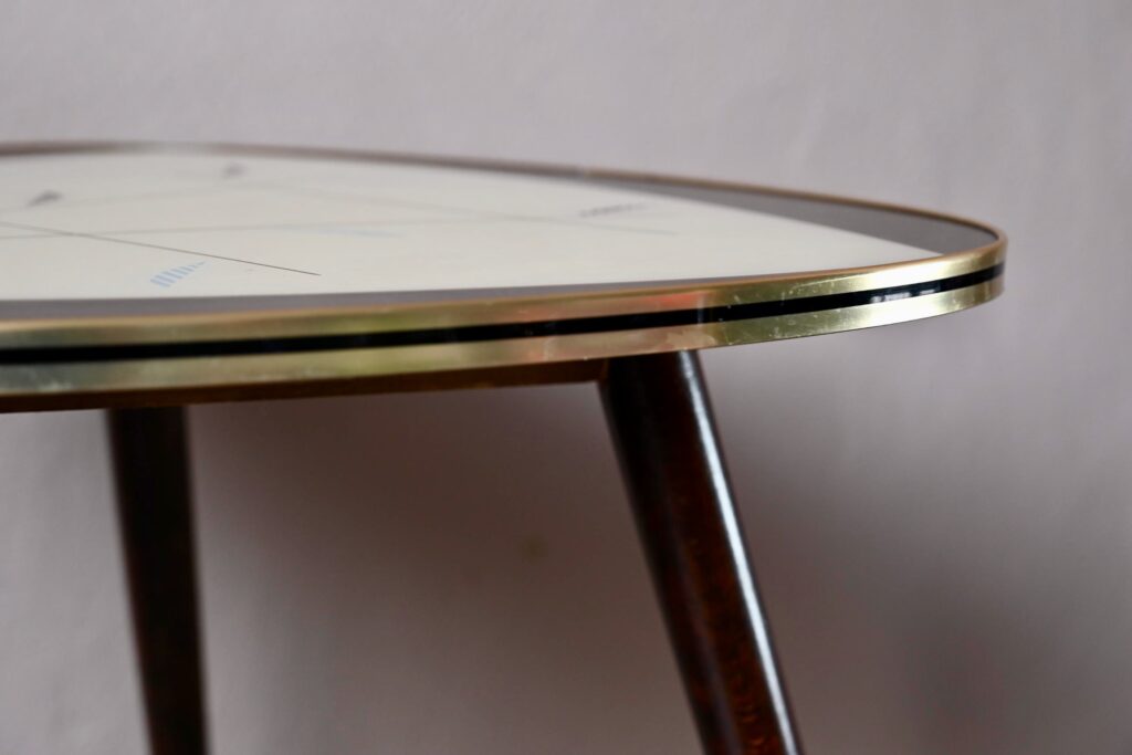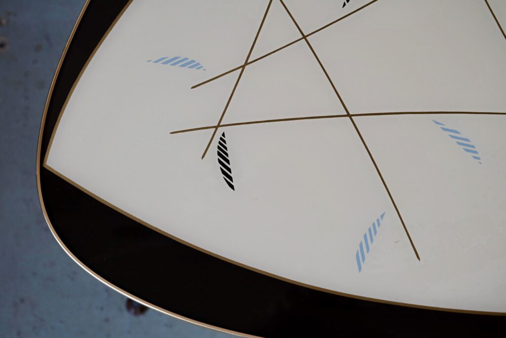 Le guéridon tripode présente un piétement compas fuseau bois. Le plateau de forme “triangulaire” est en formica noir décor doré, beige et bleu ciel. Le piétement et le plateau présentent de très légères traces d’usage mais demeurent en bel état, stable et pratique par ses dimensions réduites. Un des pieds présente un léger décroché du bois, d’origine et sans conséquence. Le chant est en vinyle doré liseré noir.