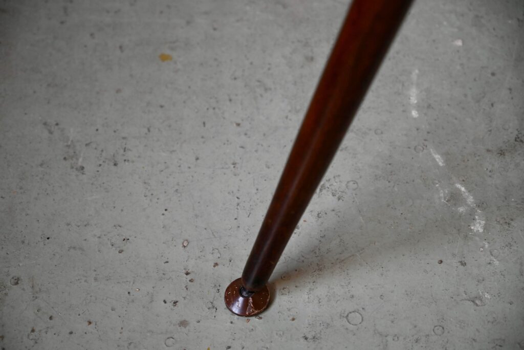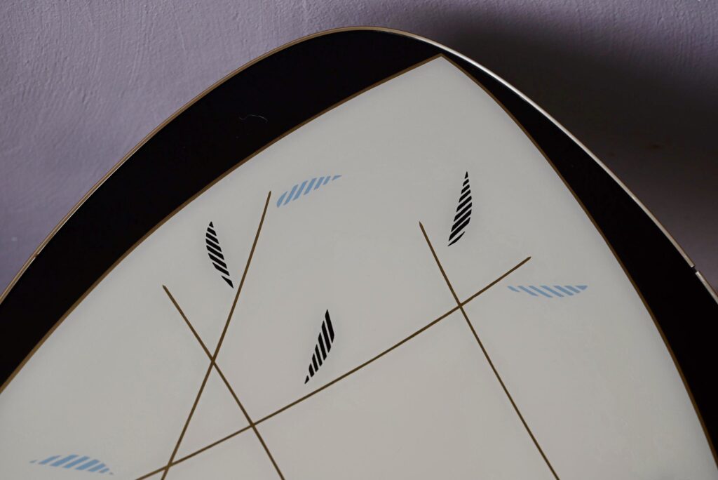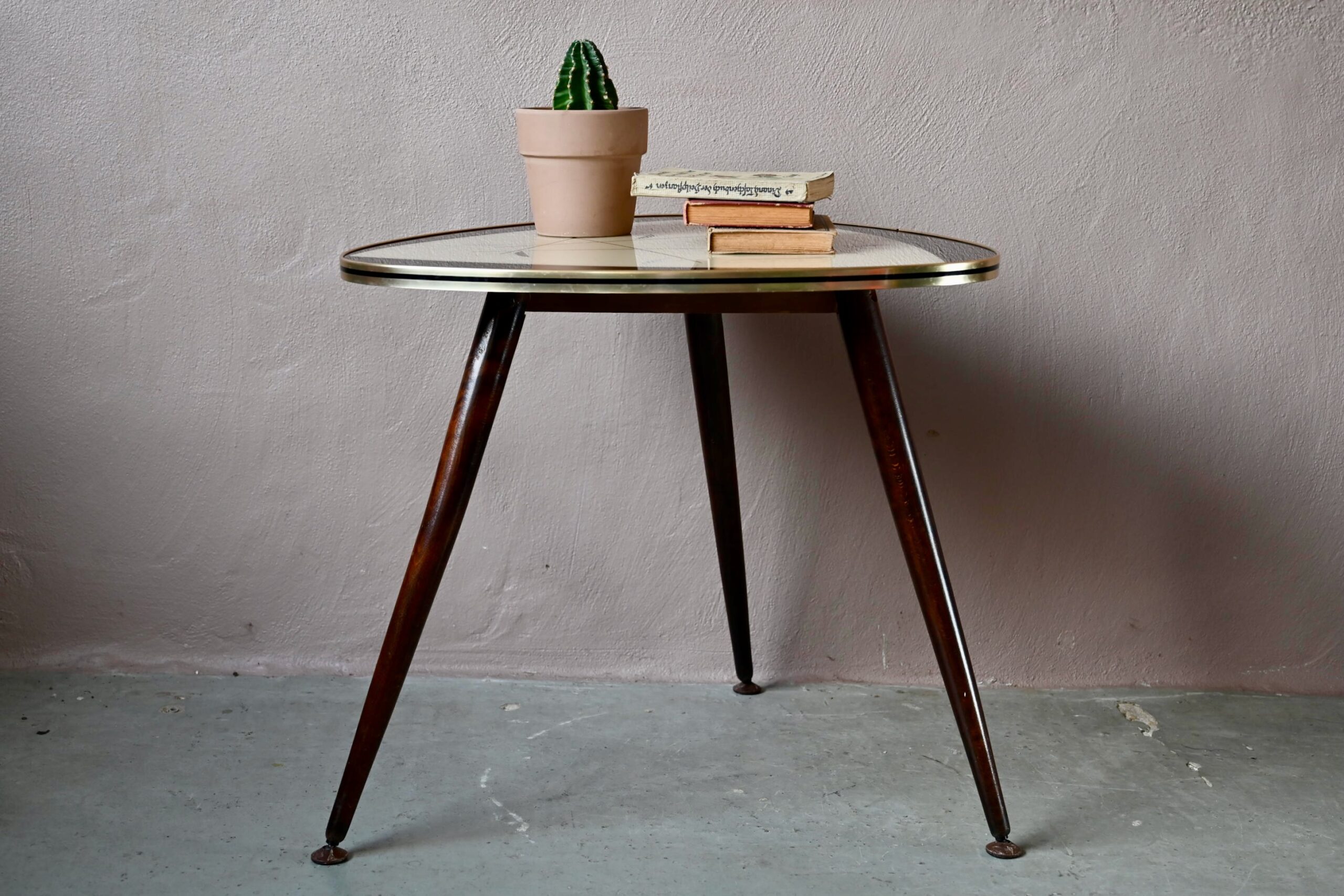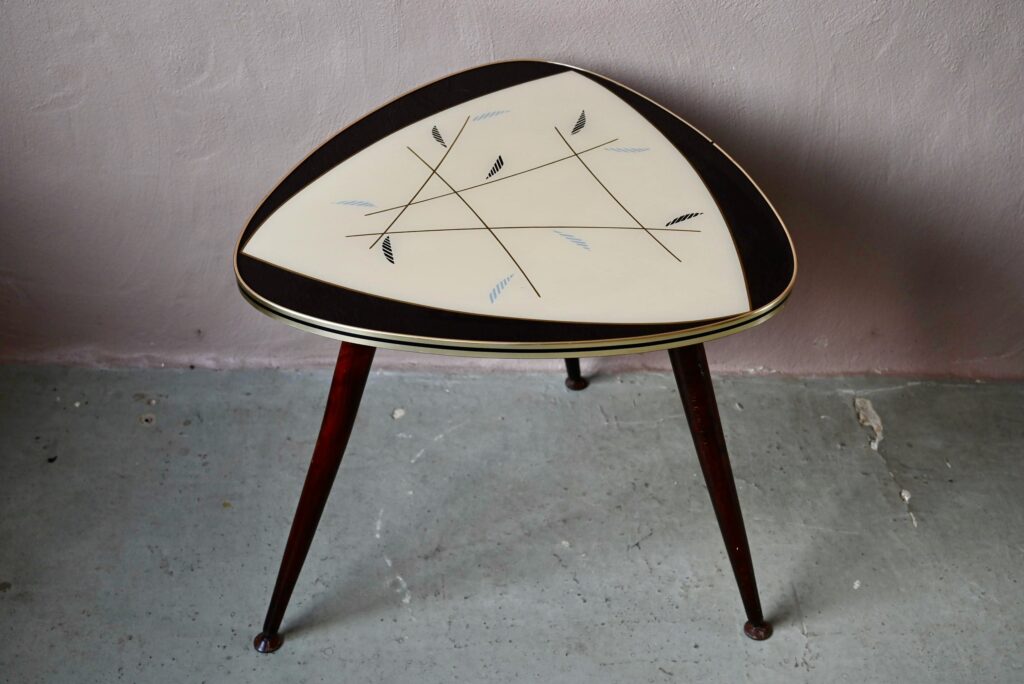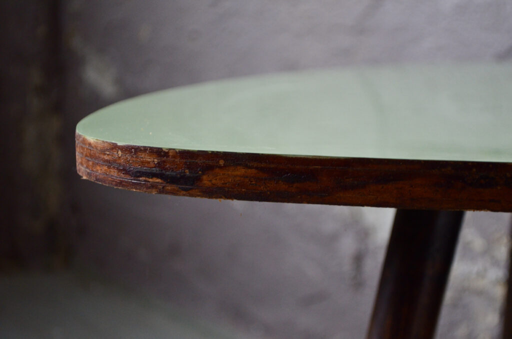 Le guéridon tripode présente un piétement compas fuseau bois. Le plateau de forme “triangulaire” est en formica noir décor doré, beige et bleu ciel. Le piétement et le plateau présentent de très légères traces d’usage mais demeurent en bel état, stable et pratique par ses dimensions réduites. Un des pieds présente un léger décroché du bois, d’origine et sans conséquence. Le chant est en vinyle doré liseré noir.