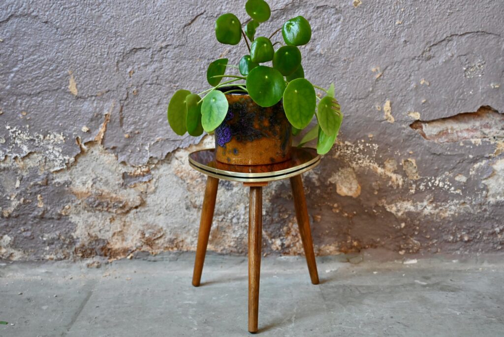 Voilà un petit guéridon vintage, simple et ultra-tendance. Plateau formica façon bois exotique et piétement tripode compas en bois teinté teck : simple et efficace comme on aime! Chevet minimaliste, bout de canapé, porte-plantes… Il trouvera sa place à coup sûr et deviendra vite un must-have.