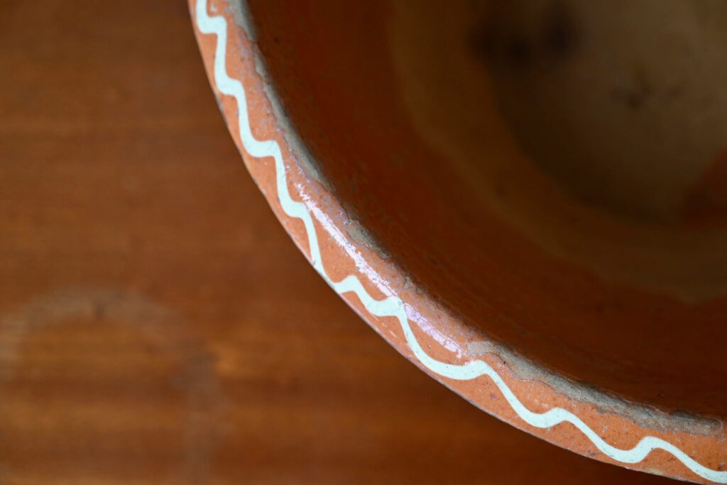 La jatte est en terre vernissée, décorée d’ondulations blanches sur le rebord. C’est une production alsacienne typique de Soufflenheim du début du 20ème siècle. Le pot est en bon état, un petit manque d’émail est à noter sur le bord.