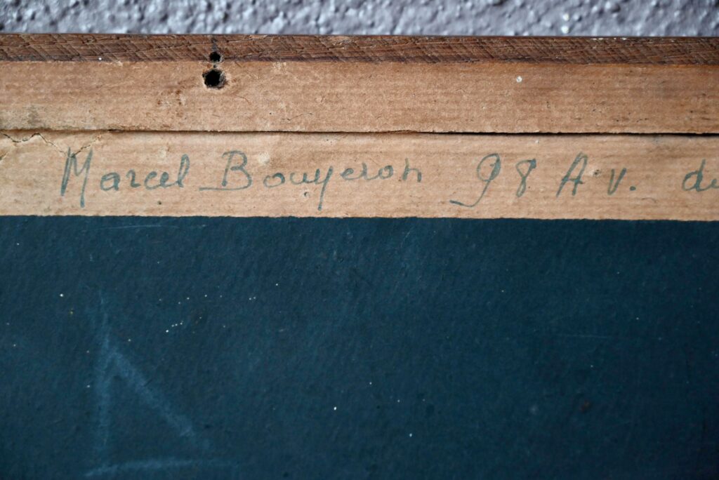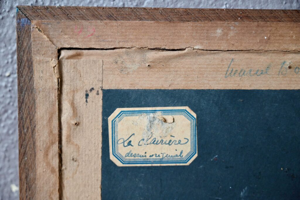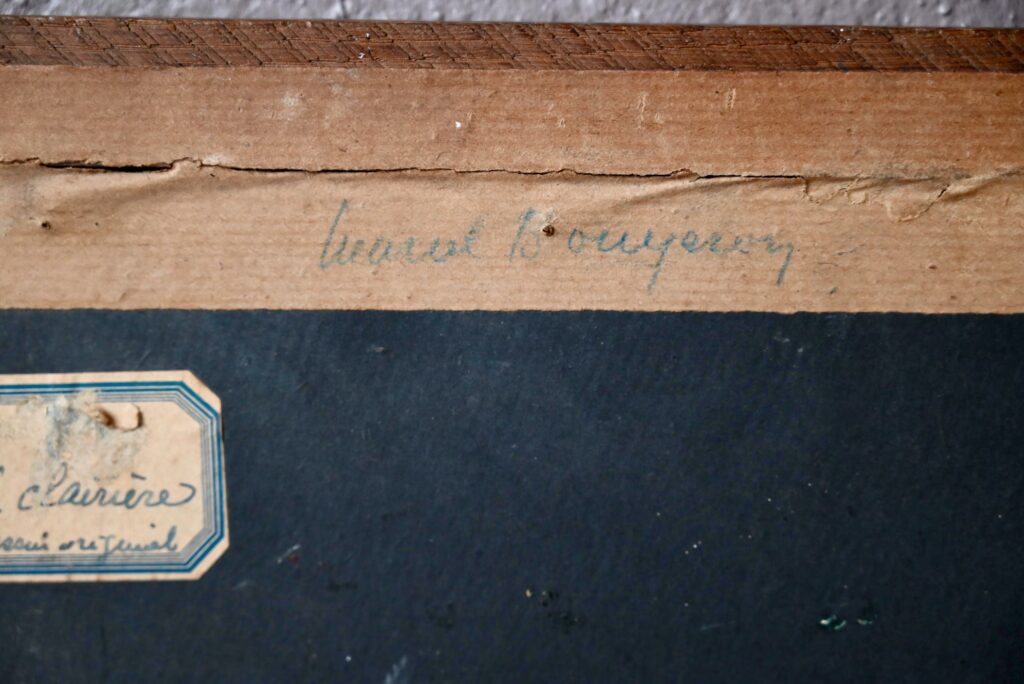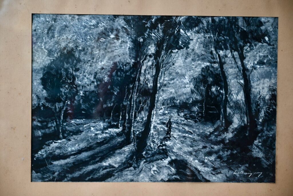 “La clairière”, oeuvre sur papier de Marcel Bouyeron (Neuilly 1890/1976). Paysage profond et tourmenté, dans une tonalité dominée par le noir. Encadré sous verre et annoté sur l’arrière. Traces d’usage légères sur le cadre.