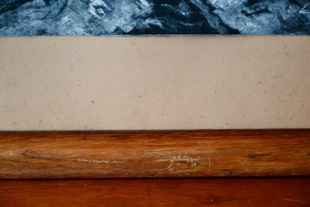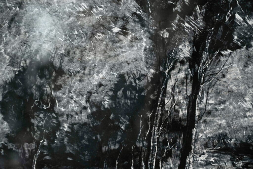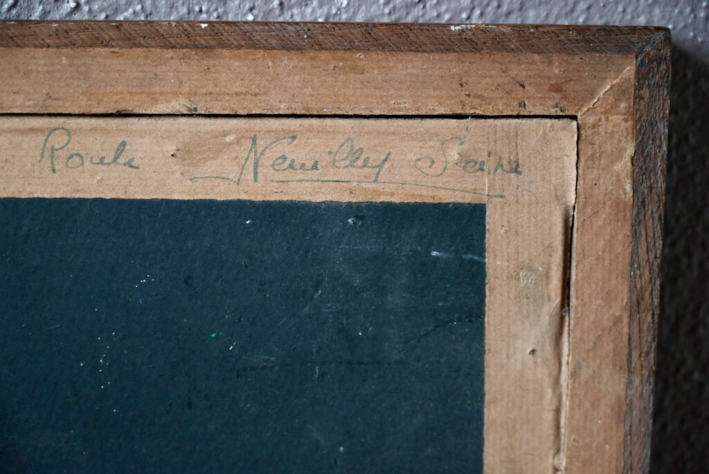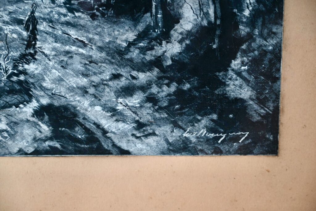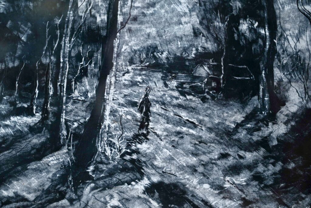 “La clairière”, oeuvre sur papier de Marcel Bouyeron (Neuilly 1890/1976). Paysage profond et tourmenté, dans une tonalité dominée par le noir. Encadré sous verre et annoté sur l’arrière. Traces d’usage légères sur le cadre.