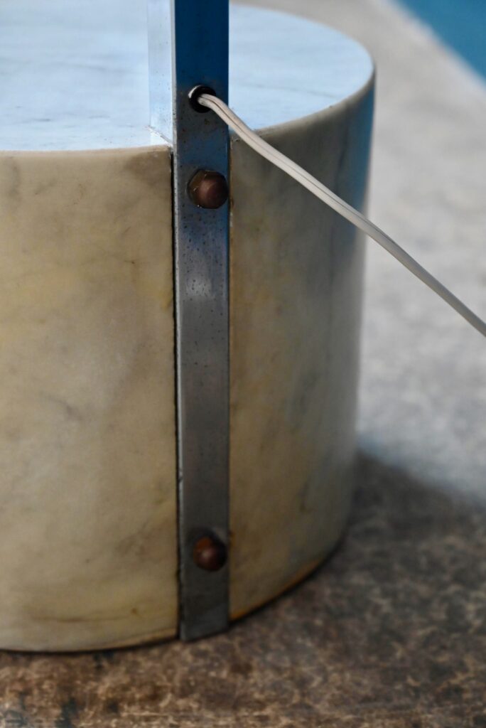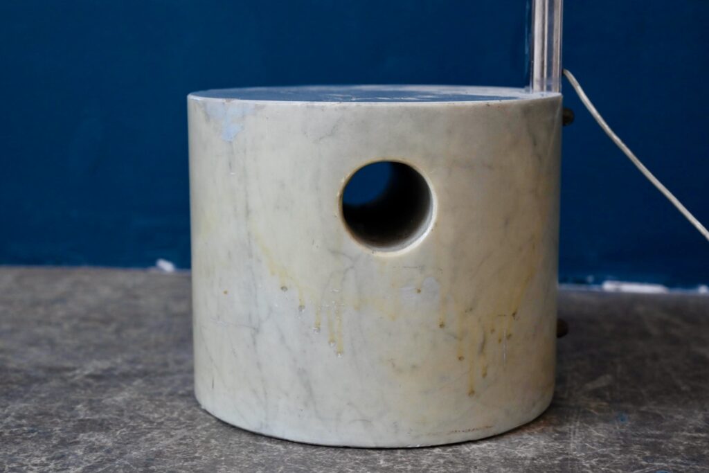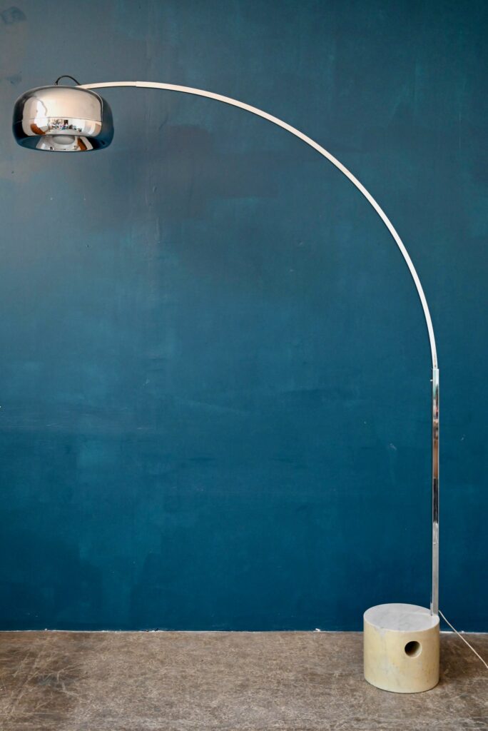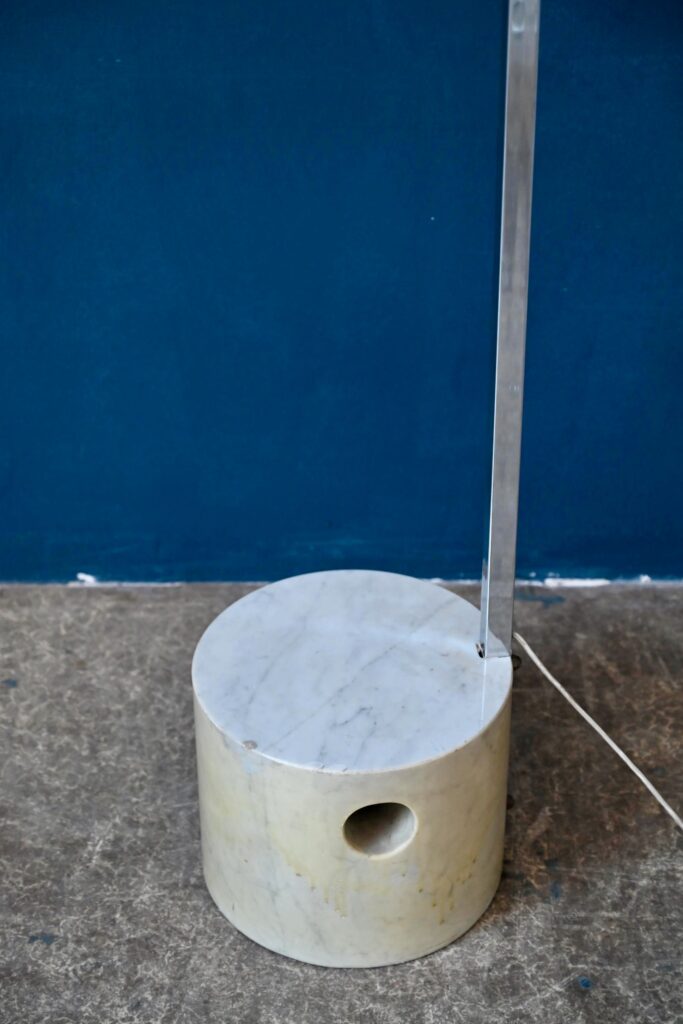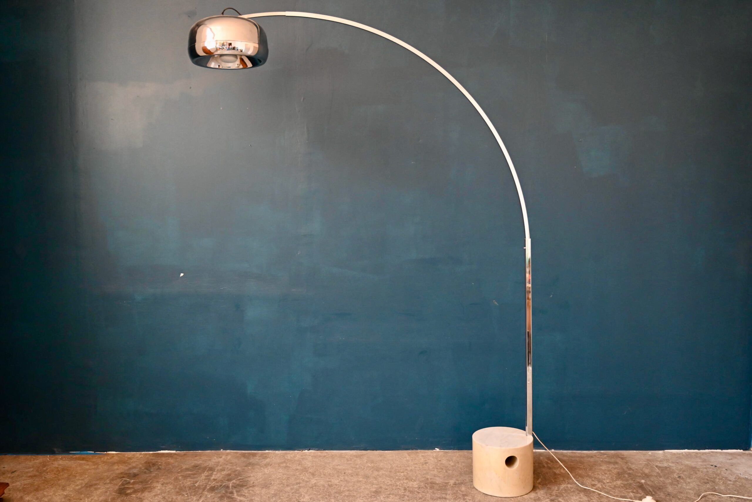 Cette grande lampe arc italienne date des années 70. Elle est parfaitement fonctionnelle, en bel état. Son piétement sculptural en marbre présente des traces de vernis et petits impacts, visibles en photo. Le déflecteur en plastique chromé est en bel état, l’arc est réglable en hauteur/profondeur. Interrupteur poussoir sol. Prise italienne en photo.