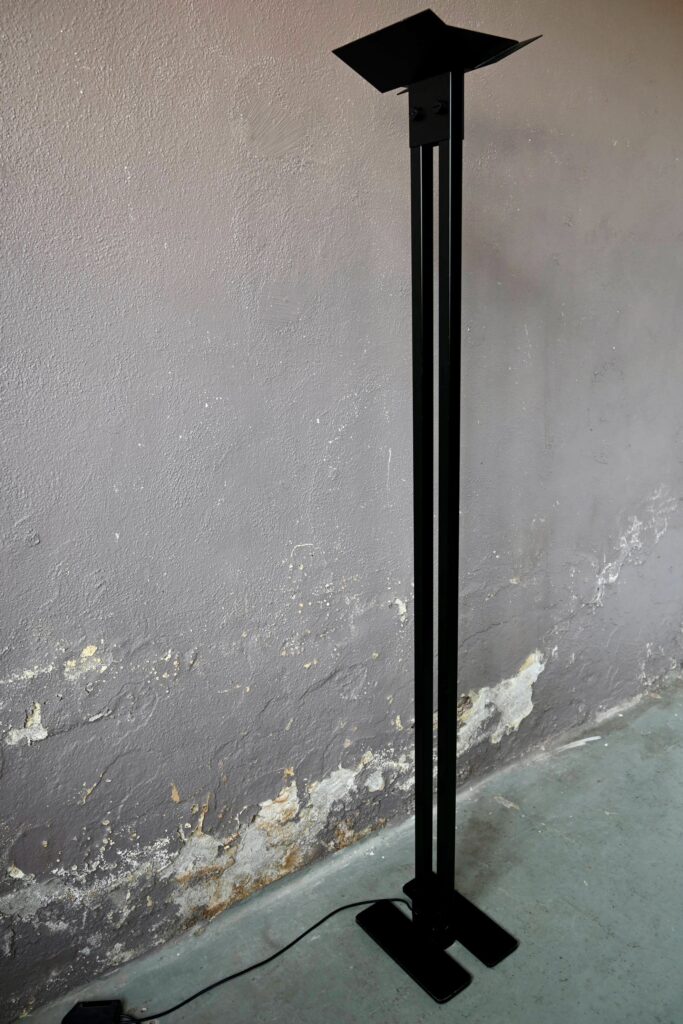Luminaire typique du design italien des années 1980, ce lampadaire aux lignes affirmées est une production de l’éditeur Relco. La lampe est constituée de pièces métalliques laquées de noir tout en verticalité, les assemblages sont visibles pour un rendu très mécanique, radical.