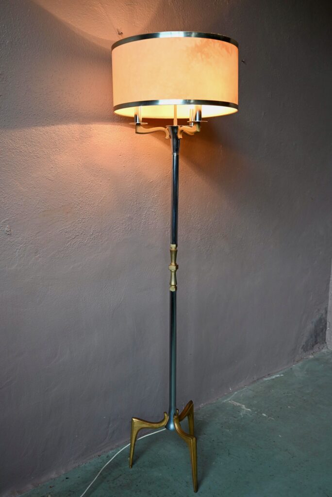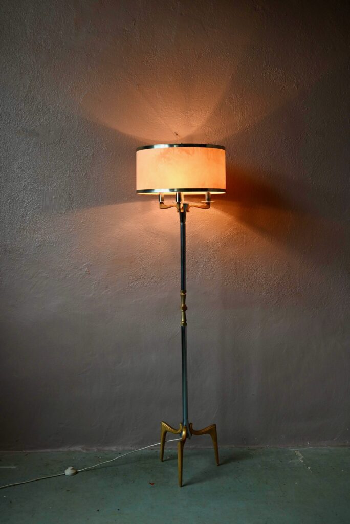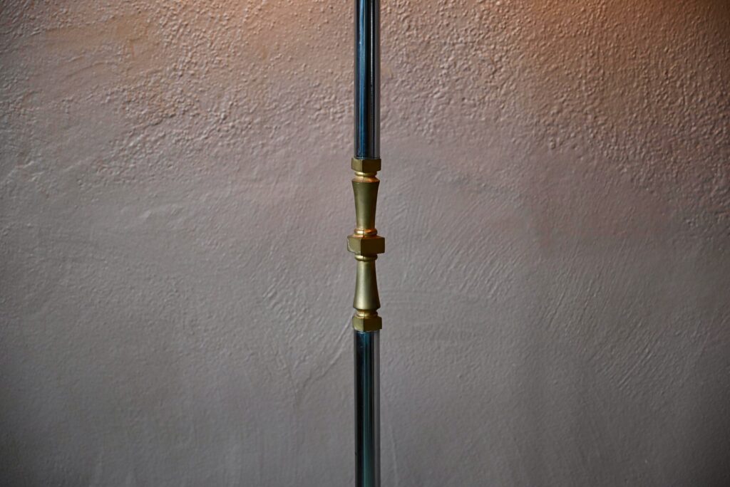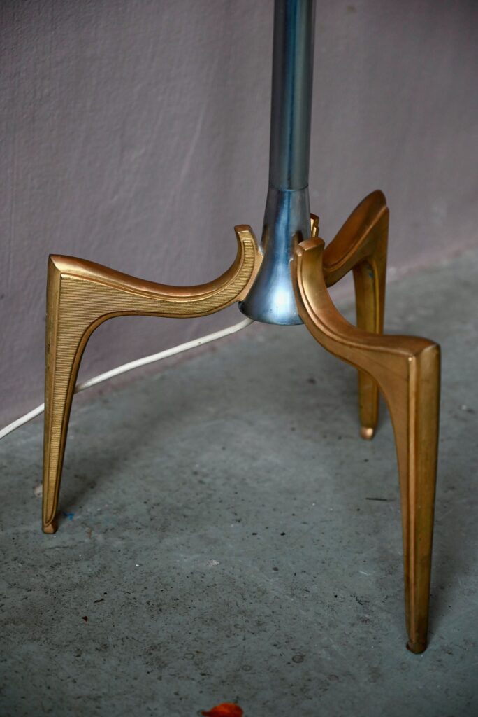 La lampe tripode date des années 60. De style Regency, elle est en acier argenté et laiton doré. Les lames de laiton constituant le piétement et les chandeliers sont joliment striées dans la matière. A mi-hauteur, un joli détail en laiton doré sur le tube principal sert aussi à saisir le pied. L’abat-jour circulaire est d’origine, il est beige avec des volutes orangées, bordé d’une lamelle en métal souple. La lampe sur pied est en bel état. Elle est parfaitement fonctionnelle. Elle est ancienne et présente des traces d’usage légères. Un interrupteur à pied est présent sur le câble.