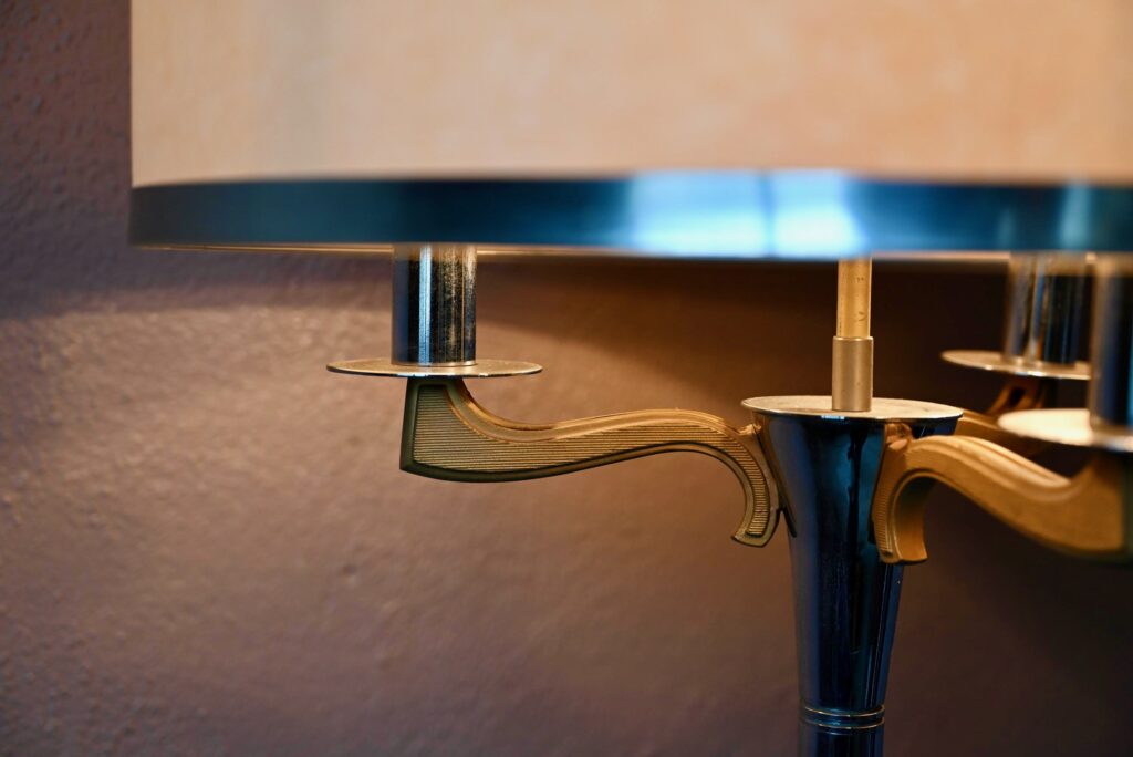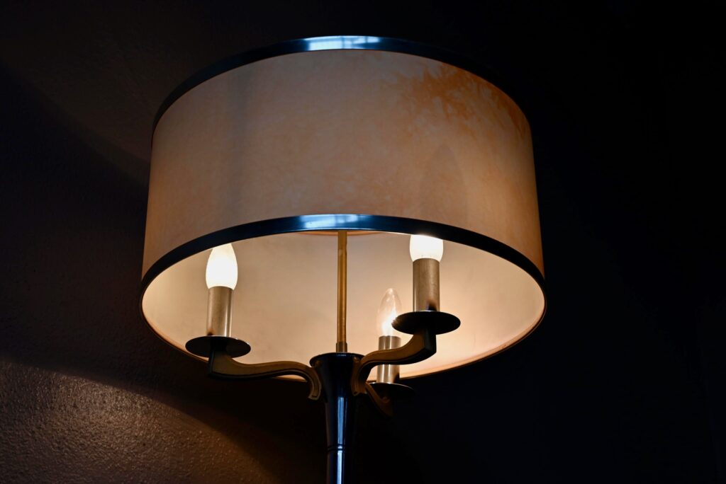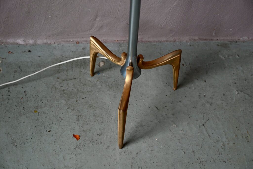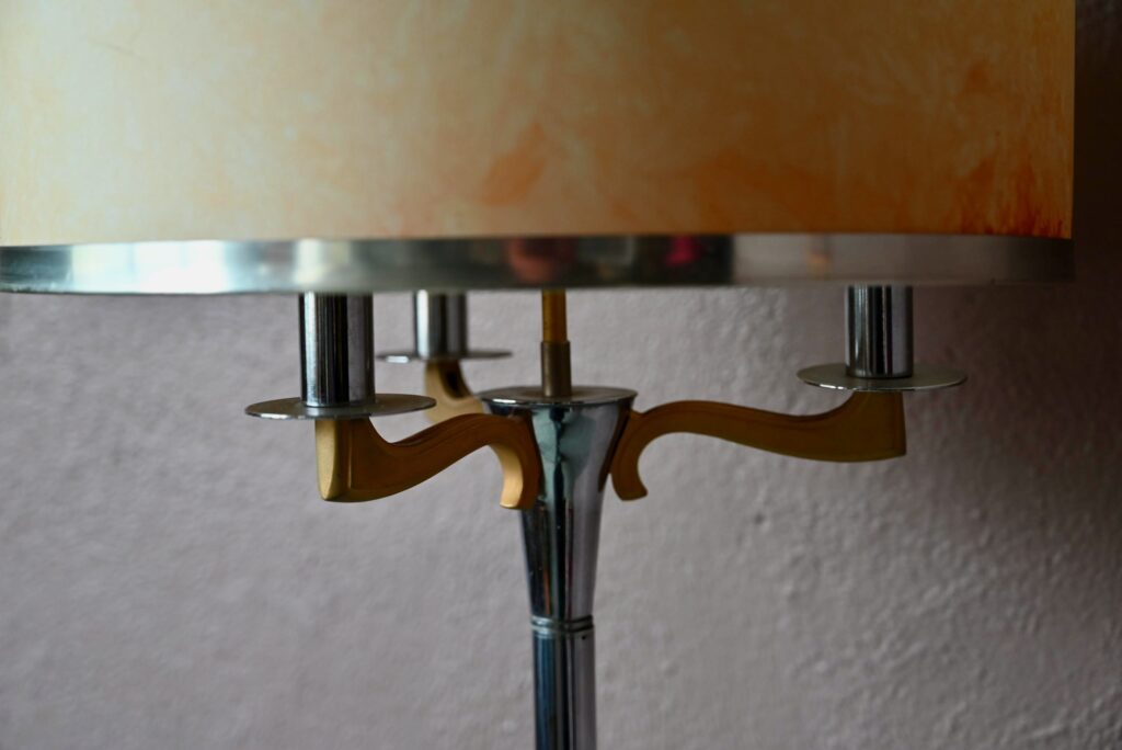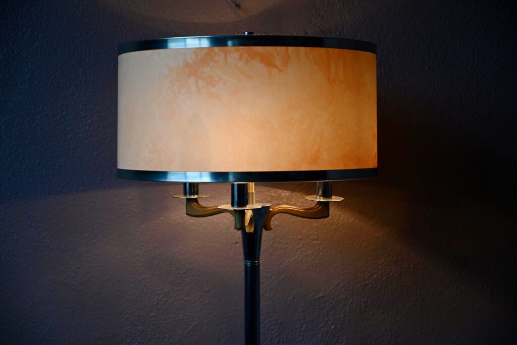 La lampe tripode date des années 60. De style Regency, elle est en acier argenté et laiton doré. Les lames de laiton constituant le piétement et les chandeliers sont joliment striées dans la matière. A mi-hauteur, un joli détail en laiton doré sur le tube principal sert aussi à saisir le pied. L’abat-jour circulaire est d’origine, il est beige avec des volutes orangées, bordé d’une lamelle en métal souple. La lampe sur pied est en bel état. Elle est parfaitement fonctionnelle. Elle est ancienne et présente des traces d’usage légères. Un interrupteur à pied est présent sur le câble.