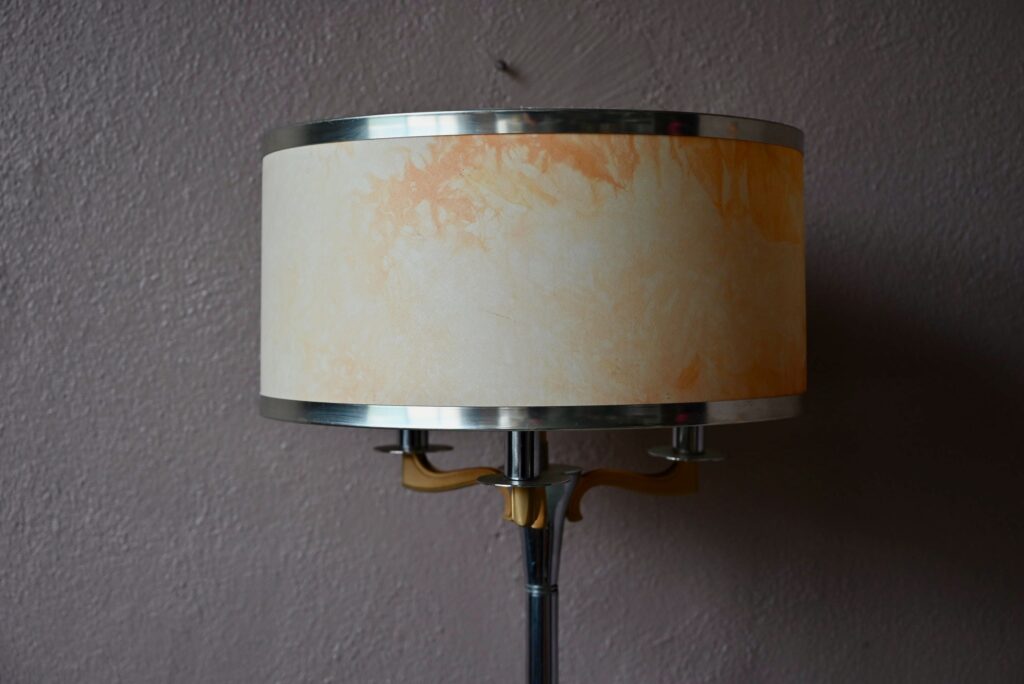 Cette belle lampe tripode typiquement Regency date des années 60, elle est originale et élégante. Ce courant esthétique qui anime le design de cette période emploie les beaux matériaux tels que le laiton, l’acier, le verre, et des lignes inspirées de l’architecture grecque et romaine. Ce lampadaire affiche un piétement tripode en laiton mat et strié, les lignes sont franches et originales. Un rappel est présent au niveau des branches du chandelier. A mi-hauteur, le laiton est encore une fois mis en scène sur le tube d’acier argenté. Le grand abat-jour est d’origine, les volutes orangées et la bordure en métal souple amènent contraste et modernité. L’ensemble est élégant, sophistiqué avec ce grain délicieusement vintage qui le caractérise.