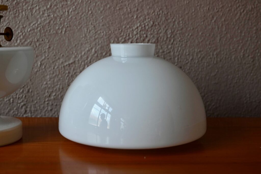 La lampe scandinave est en verre opalescent, transparent et verre multicouche. Elle est en très bon état. Elle a été fabriquée au Danemark par la verrerie Holmegaard. Elle porte son étiquette d’origine.