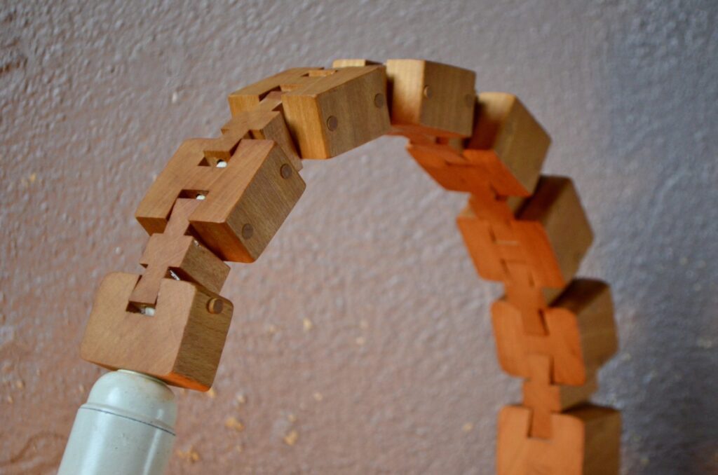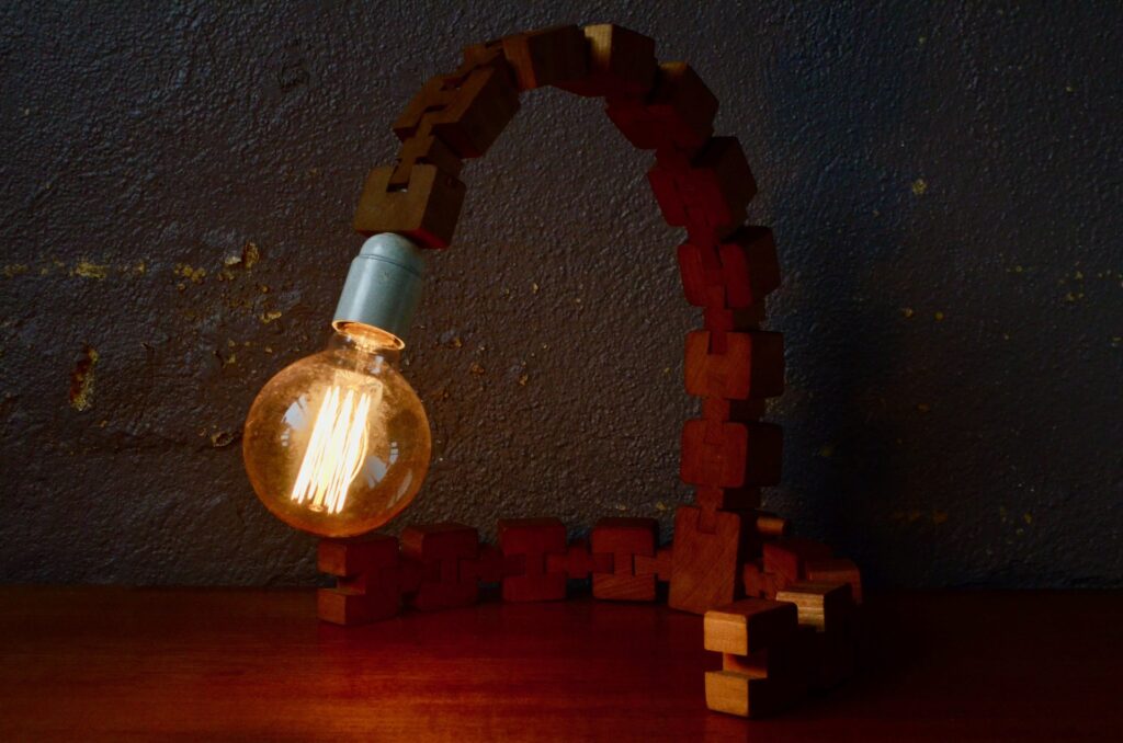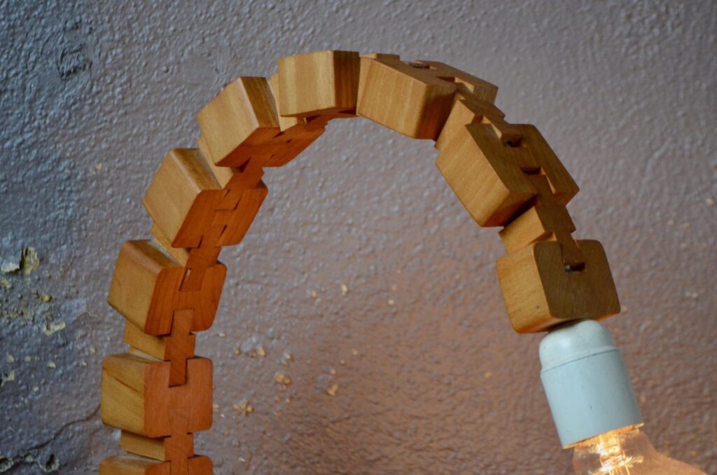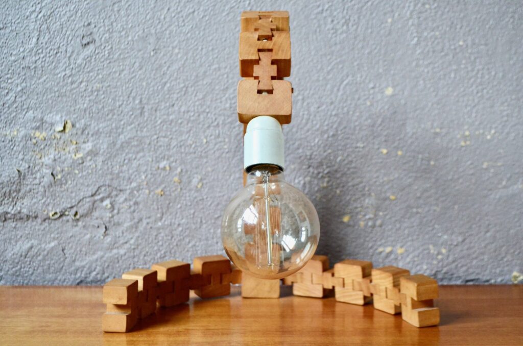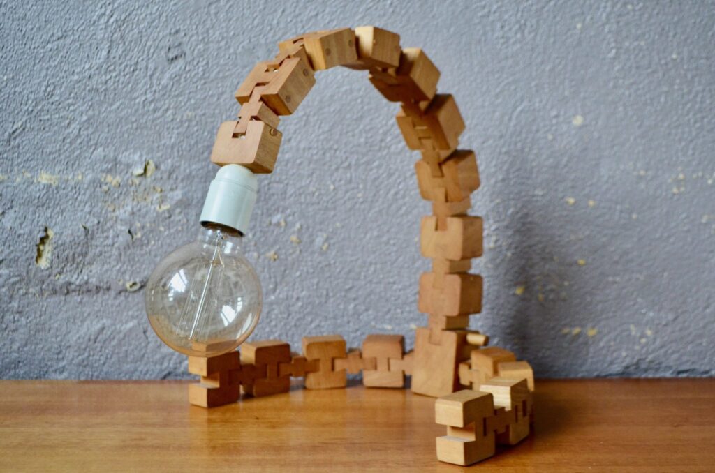 Parfaite représentante du design modulaire, cette lampe à poser est composée d’une série de cubes en bois massif reliés par des rotules mobiles. Telle une colonne et ses vertèbres, ils permettent de créer des courbes et d’adapter l’éclairage et l’esthétique à l’espace… ou à une lubie! Voici une lampe peu commune, idéale pour les amoureux de design vintage et tous ceux qui recherchent un luminaire à la fois fonctionnel et doté d’une forte personnalité.