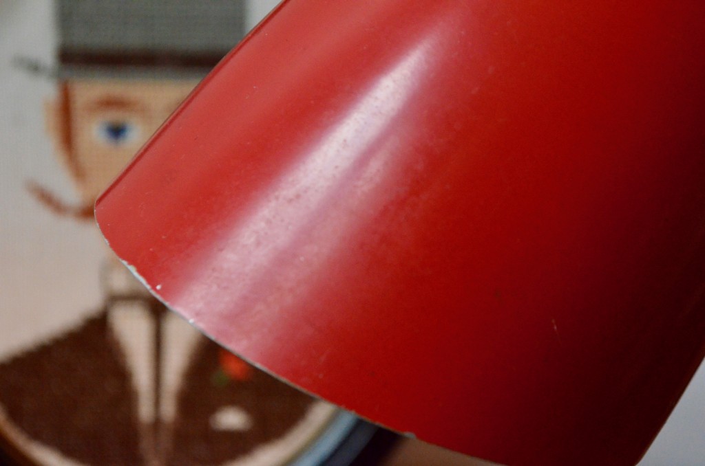 La lampe est typée “fifties”. Elle est à poser ou à suspendre en applique. Quelques manques de peinture sont à noter ainsi qu’un petit impact sur l’arrière du déflecteur, la couleur est vive. L’électrification est d’origine, elle fonctionne.