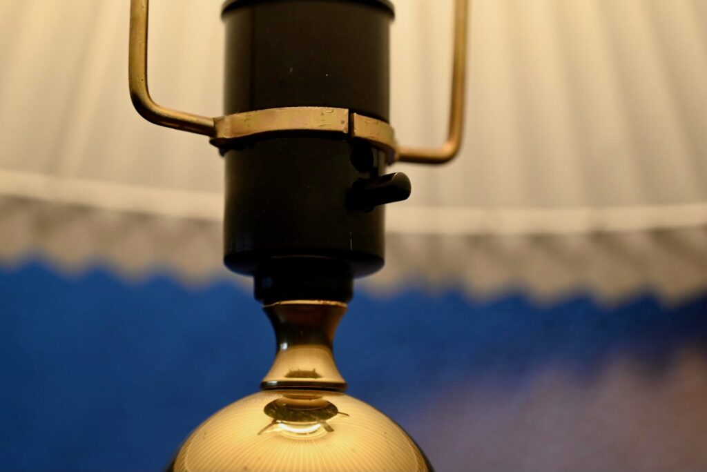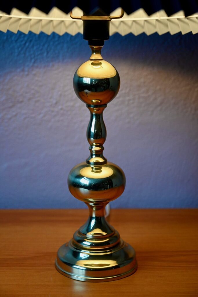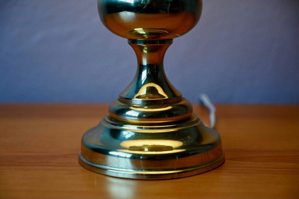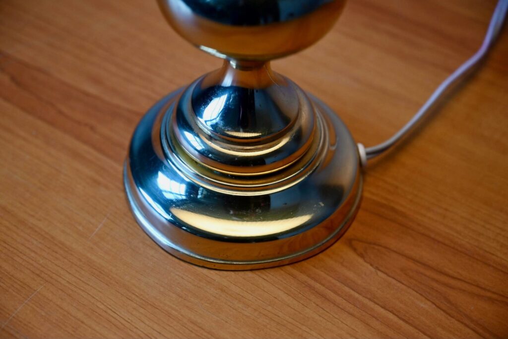 La lampe à poser est de grande taille et de très belle facture. Des traces d’usage et un léger enfoncement sont visibles sur le pied. Le pied de lampe est tout en métal, dans une teinte or jaune, à la surface polie et brillante.