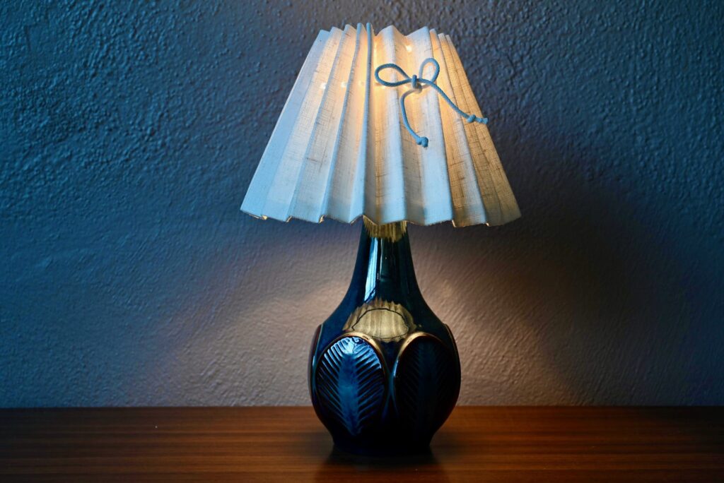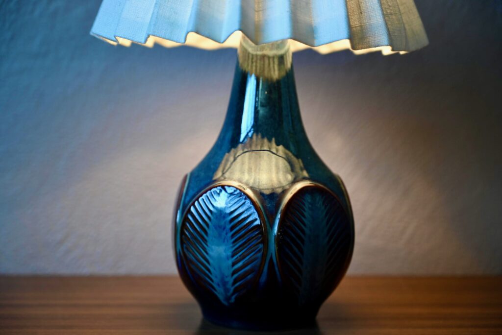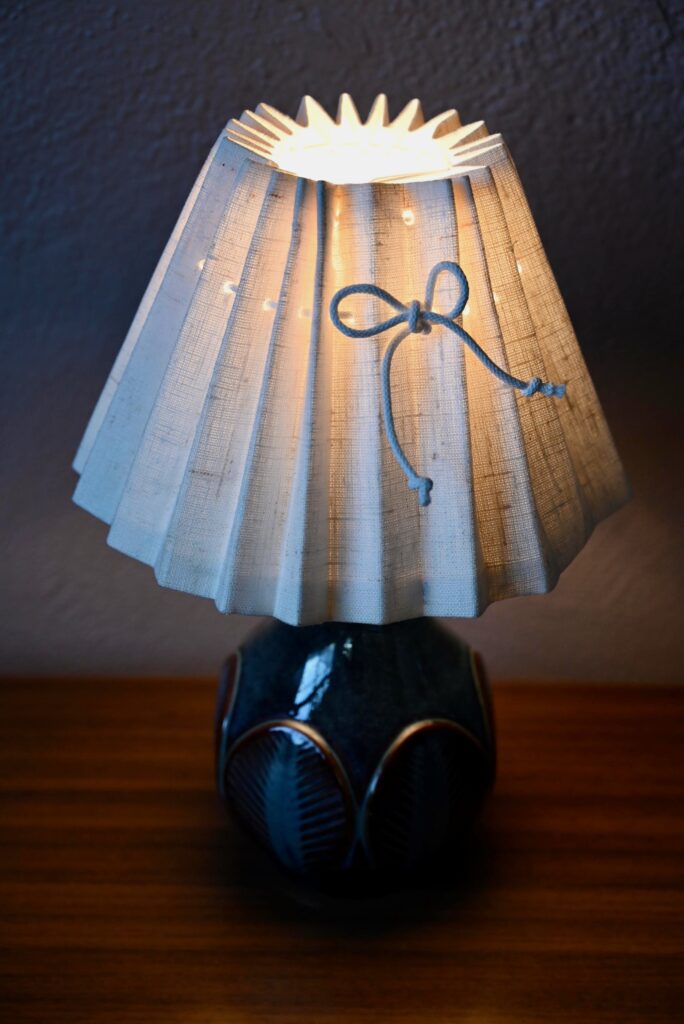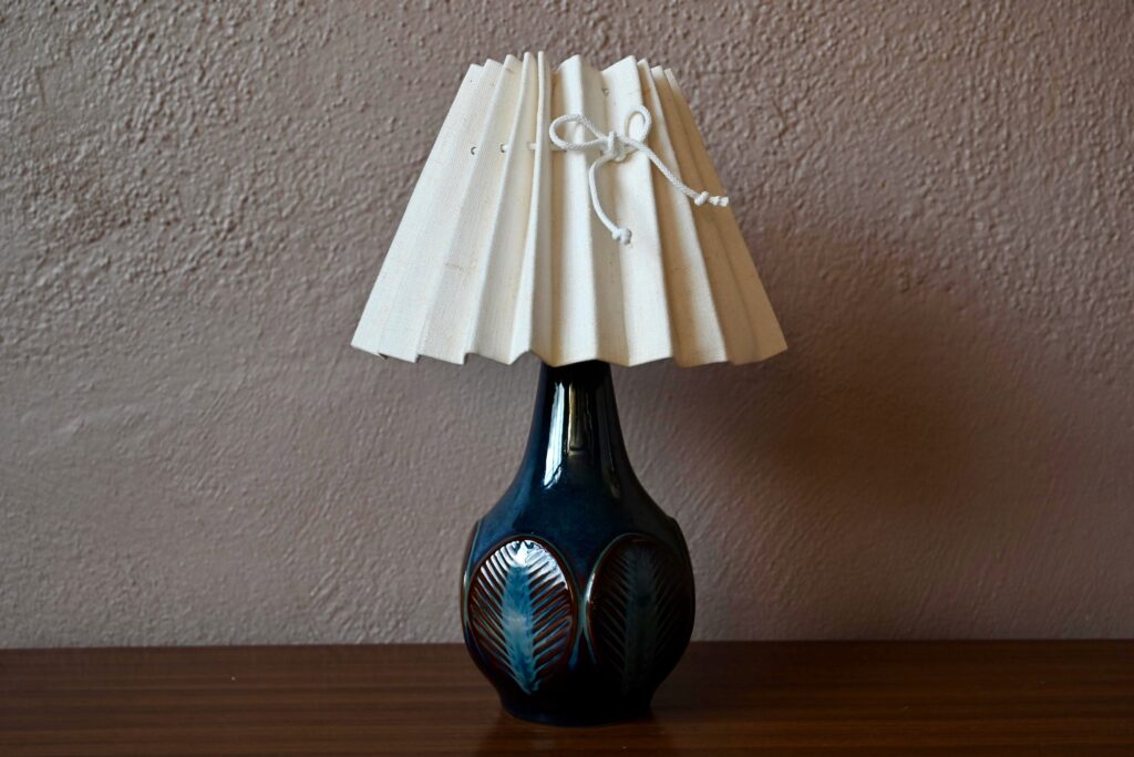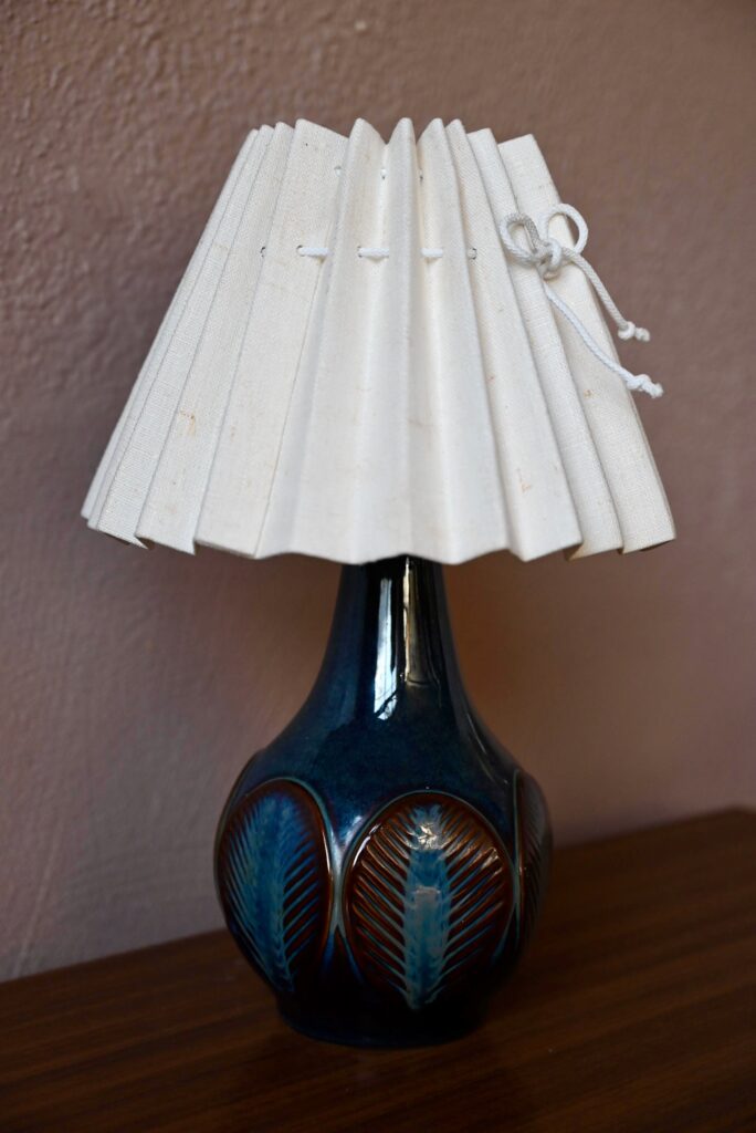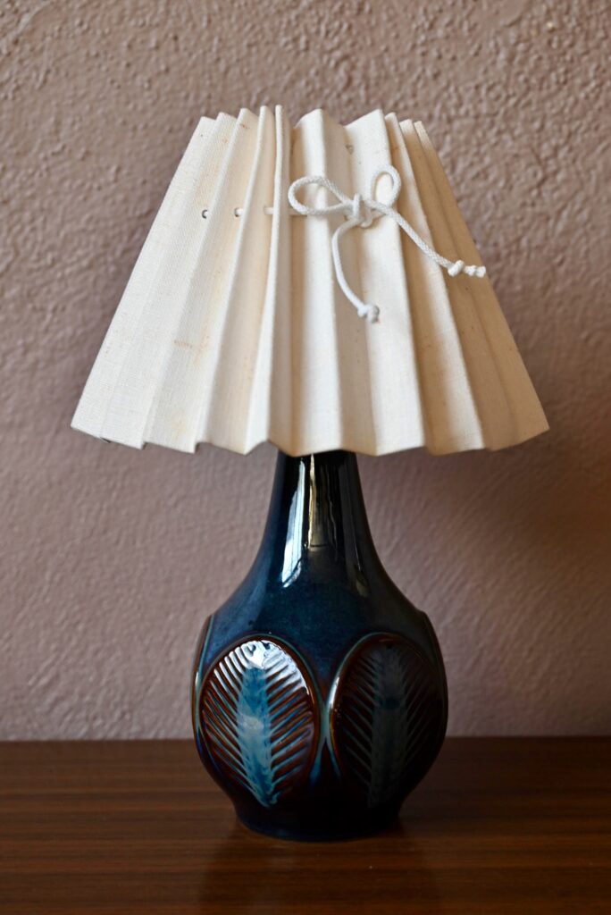 Le pied de la lampe danois est en grès émaillé, motifs stylisés “feuille”, tons de bleu. Elle est de très belle facture, produite par Søholm Stentøj. Elle est en bel état. L’abat-jour est en tissu plissé, détail noeud en cordon. Un fêle est à noter sur le support électrique de l’ampoule, visible en photo. Le pied est signé à la main.