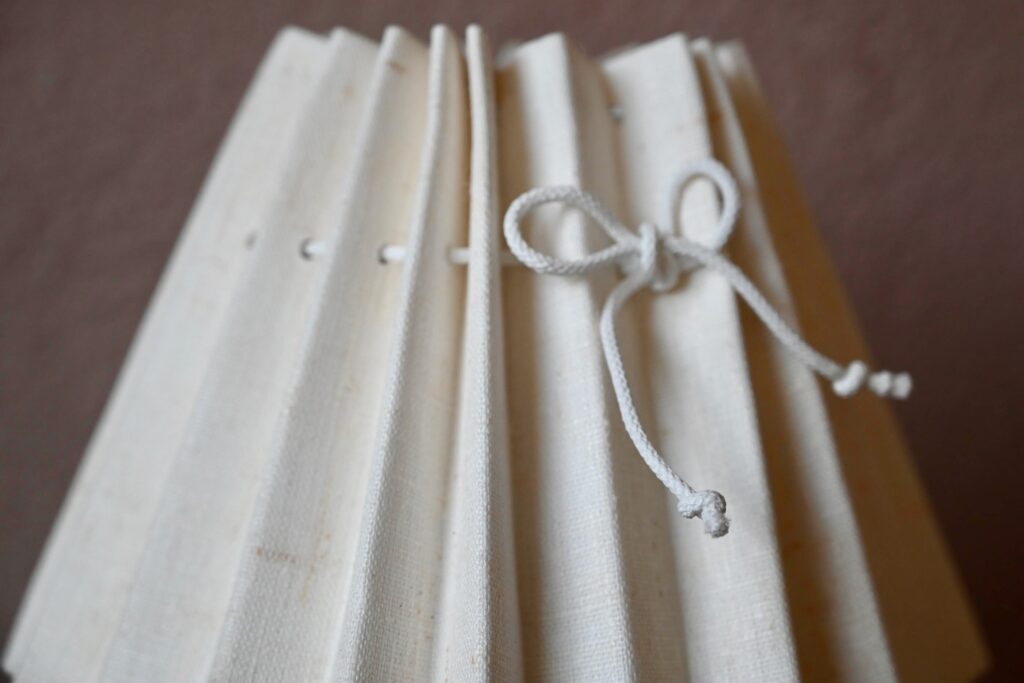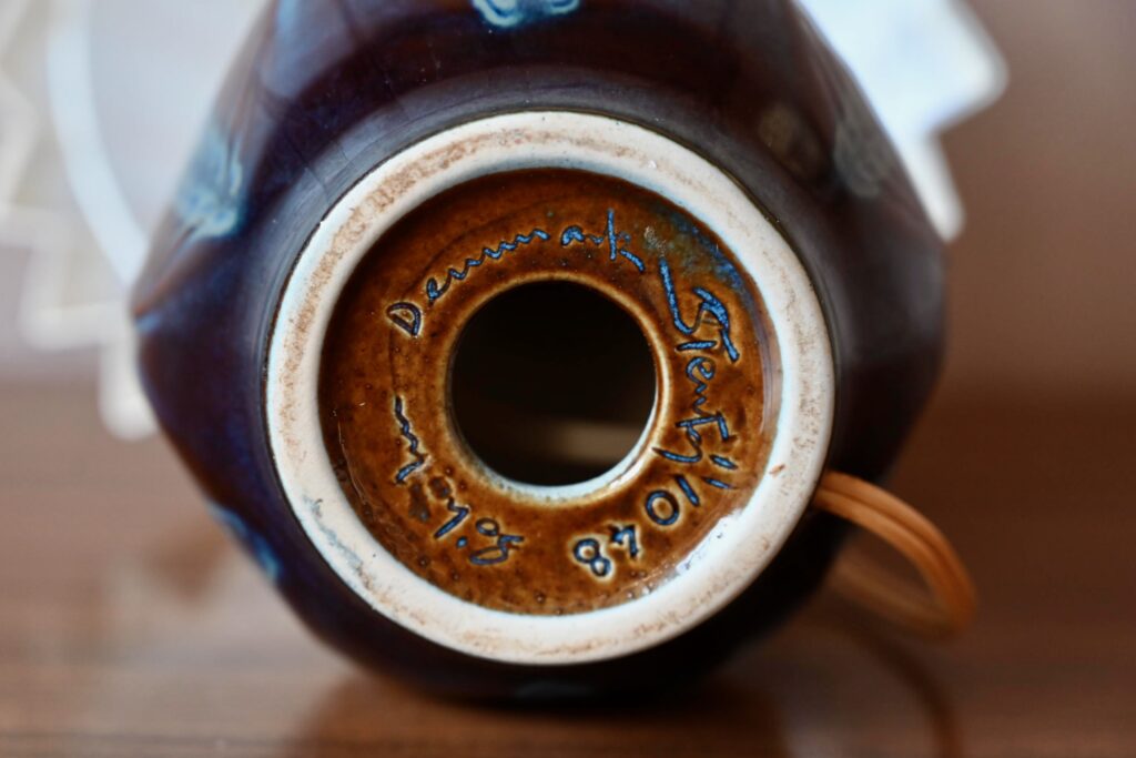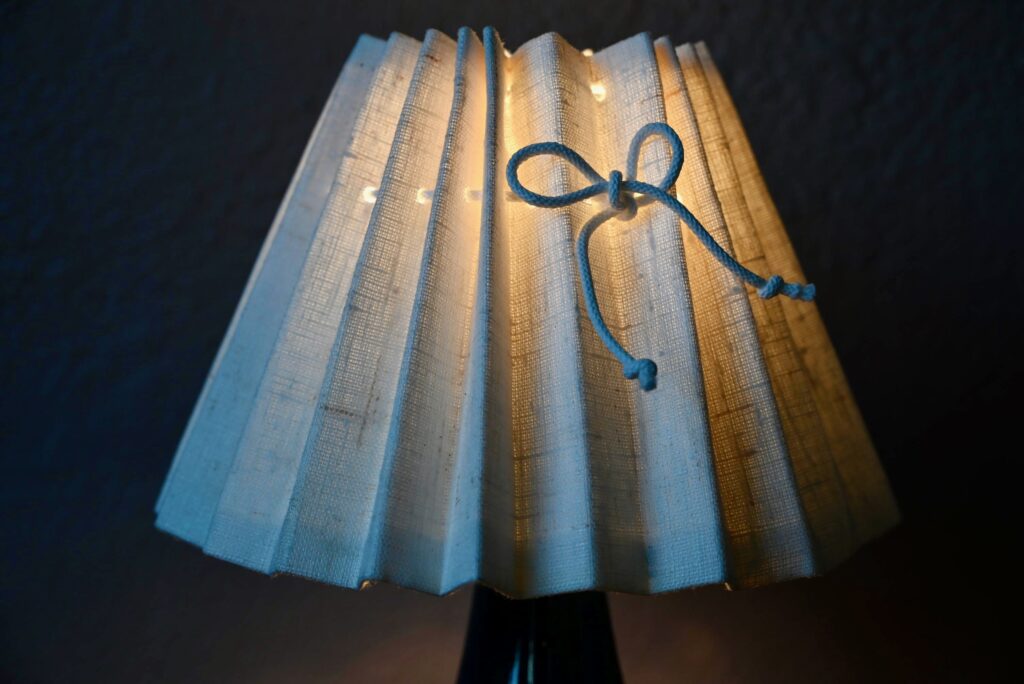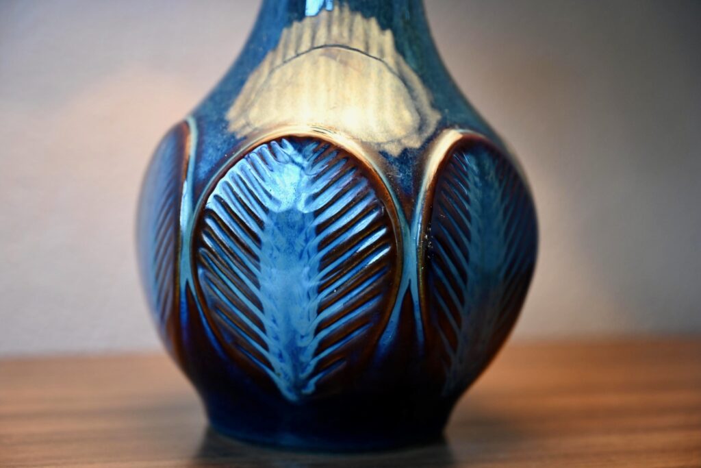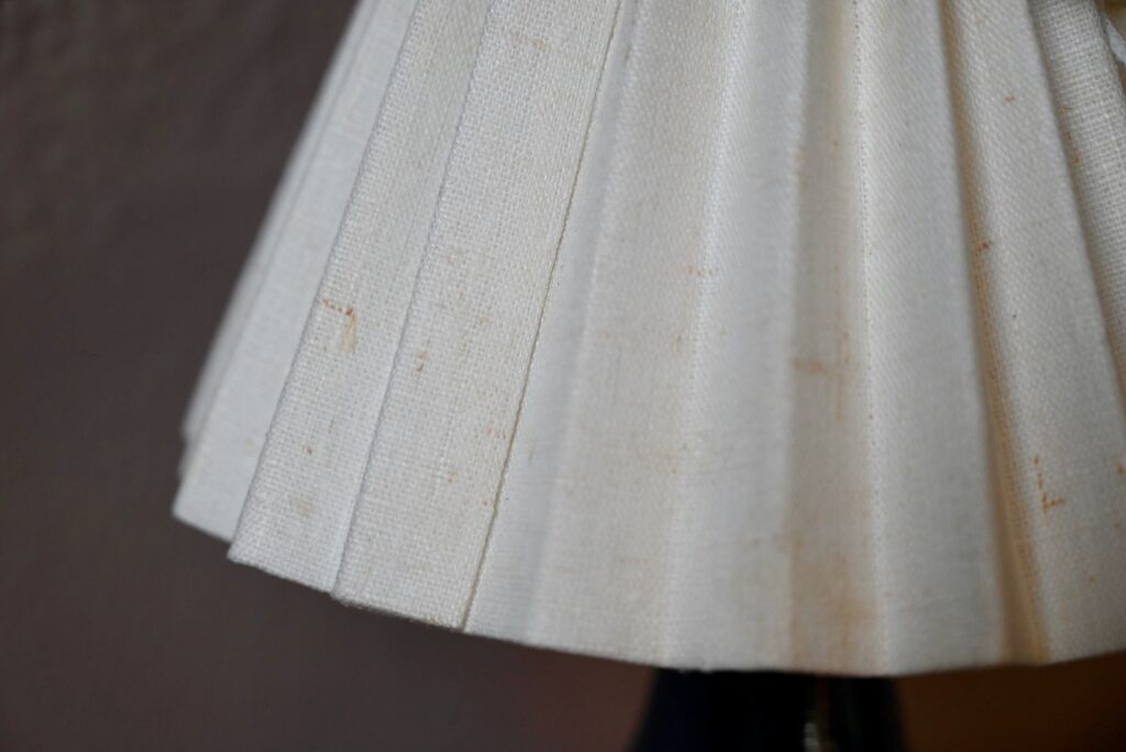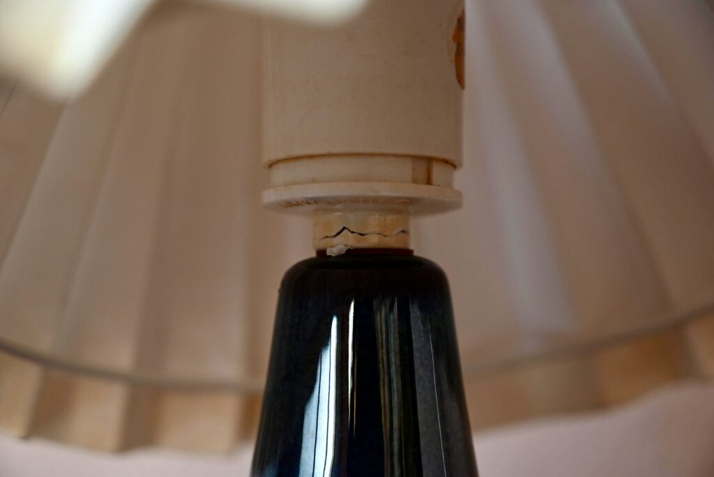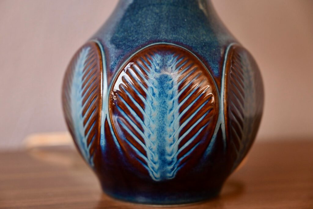 Le pied de la lampe danois est en grès émaillé, motifs stylisés “feuille”, tons de bleu. Elle est de très belle facture, produite par Søholm Stentøj. Elle est en bel état. L’abat-jour est en tissu plissé, détail noeud en cordon. Un fêle est à noter sur le support électrique de l’ampoule, visible en photo. Le pied est signé à la main.