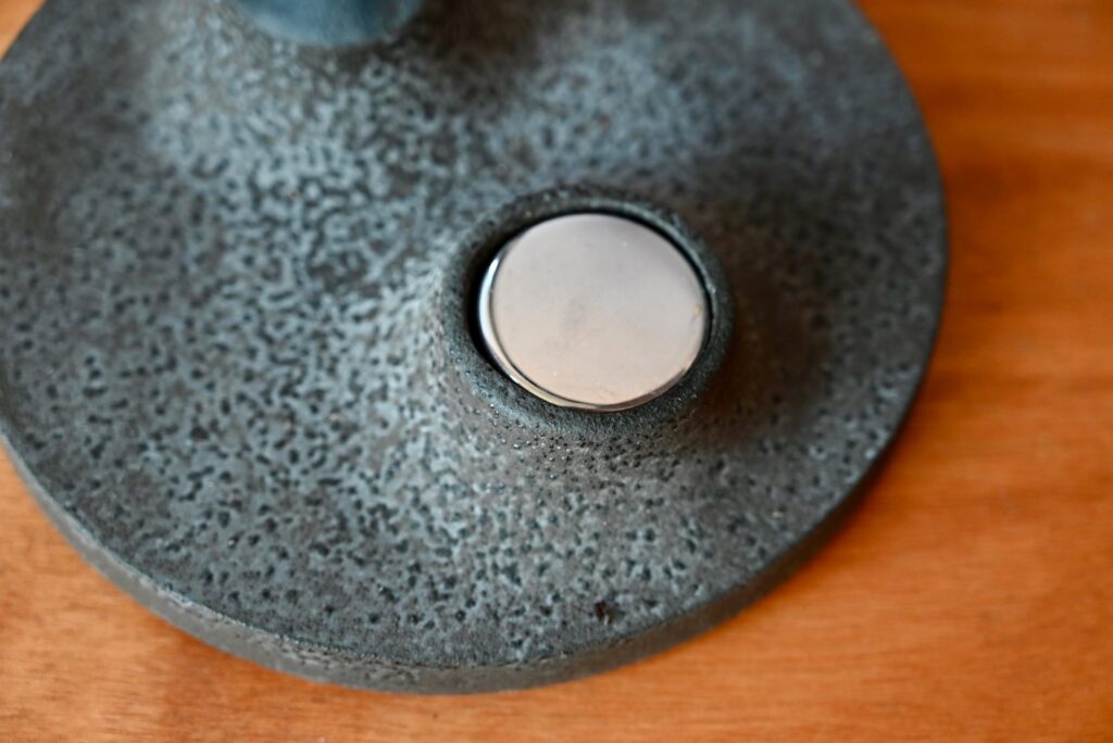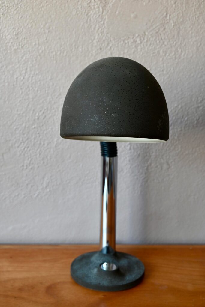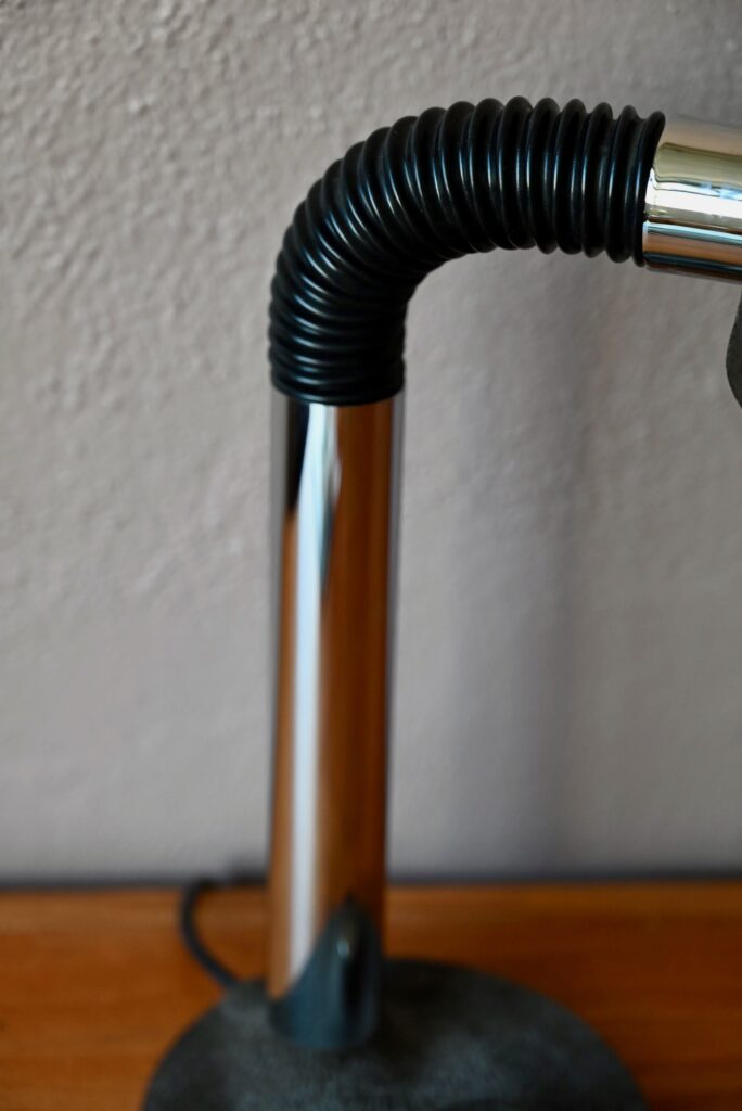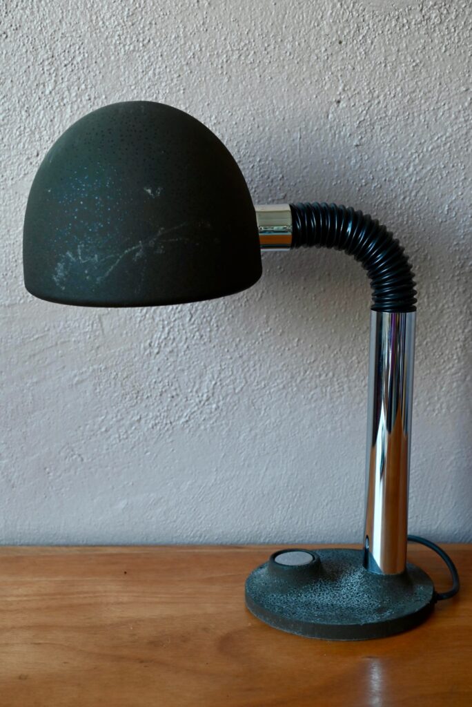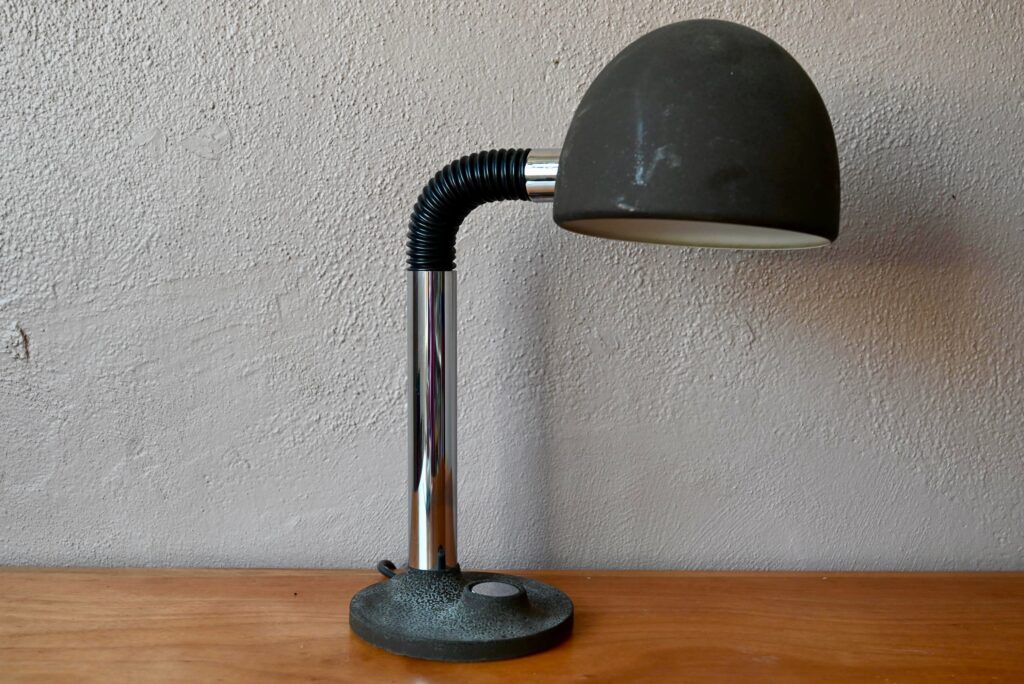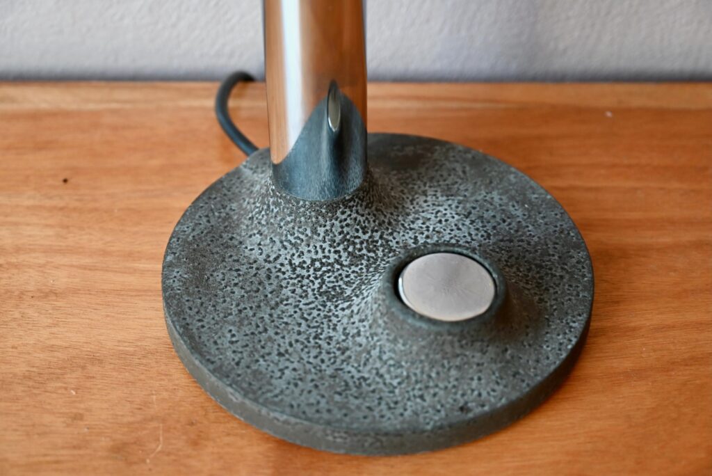 Fabriquée et distribuée dans les années 70 par l’entreprise allemande Hillebrand Leuchten, cette lampe de bureau imaginée par Egon Hillebrand affiche des lignes Bauhaus touchantes. Son design fonctionnaliste associe lignes simples mais marquantes, et matériaux de qualité tels que la fonte et le chrome. Nous aimons l’exagération du dessin et des proportions : le gros bouton poussoir chromé, le déflecteur en demi-sphère, le tubage chrome épais. Basée sur la fonction d’éclairage, sa tige chromée associe un flexible permettant d’orienter la source lumineuse. Avec sa personnalité forte, cette lampe design sera une pièce déco remarquée sur un grand bureau ou une belle enfilade.