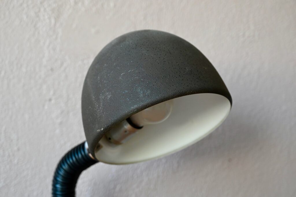 La lampe de bureau imaginée par Egon Hillebrand pour la firme allemande Hillebrand Leuchten est une production des années 70. Elle est en bel état, l’électrification est parfaitement fonctionnelle. Quelques traces du temps sont à noter, en particulier sur le socle en fonte noire et le déflecteur.