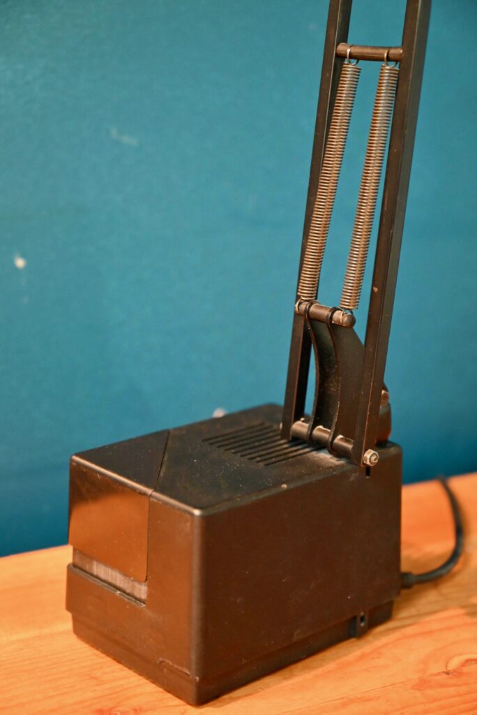 La lampe de bureau Fase est orientable. Elle est fabriquée en matière plastique et métal de couleur noire. Le système de réglage est astucieux et permet une grande amplitude et souplesse d’éclairage. Des traces d’usage et rayures légères sont visibles. L’étiquette d’origine est toujours présente.
