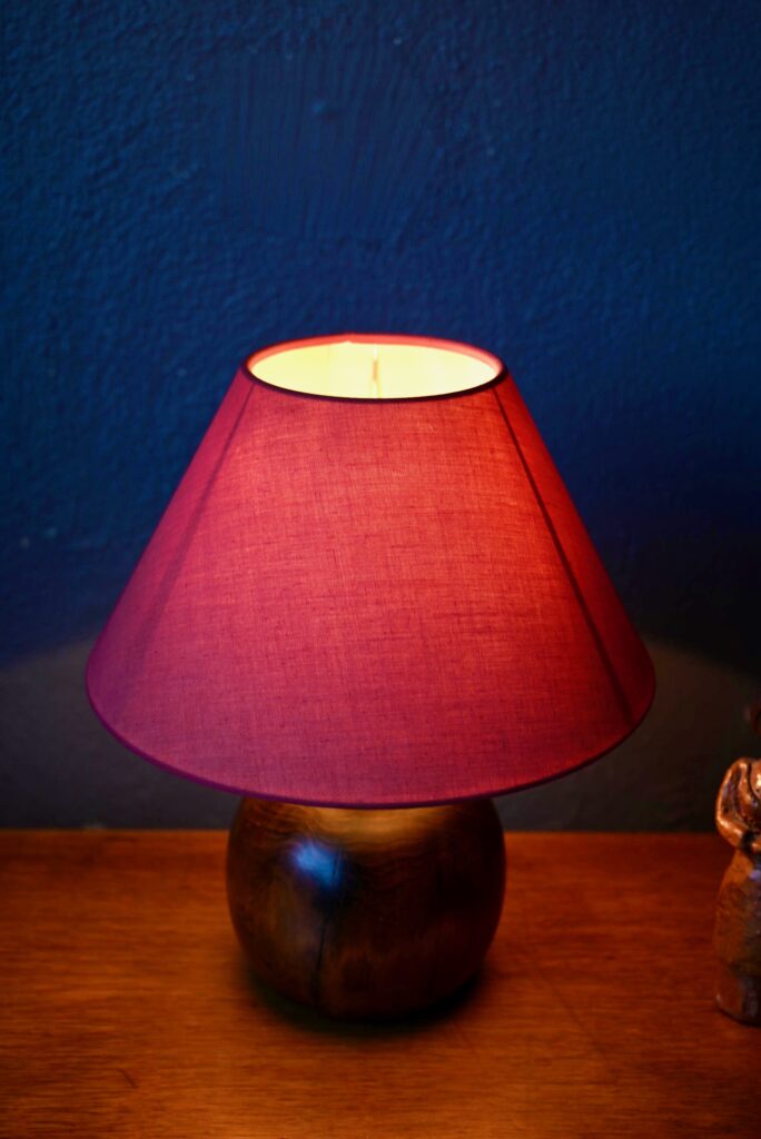 Cette lampe est en bon état. De légères traces d’usage sont visibles sur le bois et l’abat-jour. L’électrification d’origine est parfaitement fonctionnelle.