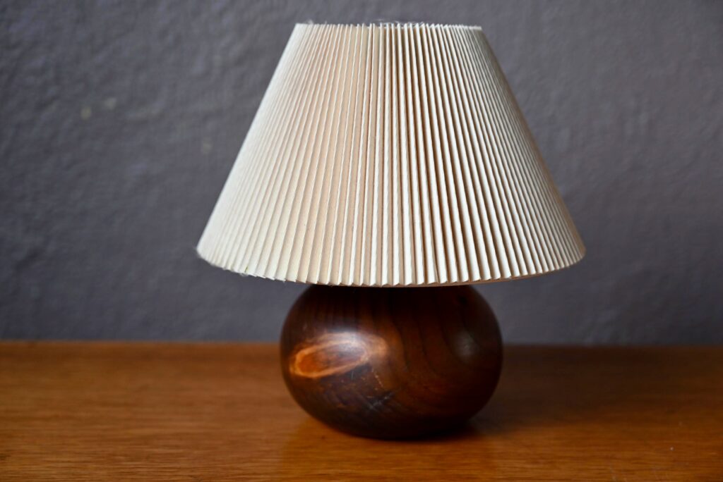 Cette jolie lampe est une production artisanale intéressante. Une large boule de noyer massif fortement veiné tient lieu de socle, pour un effet décoratif, rustique et sobre, complété par un abat jour plissé. Parfaite lampe d’ambiance, elle apportera une touche originale à la déco intérieure.