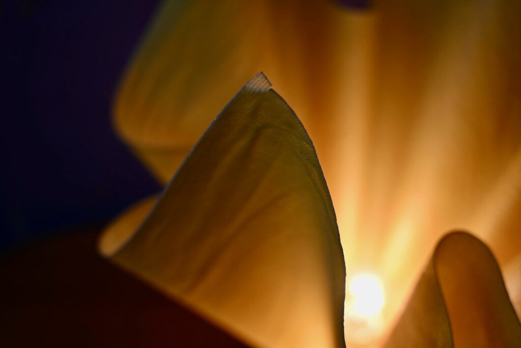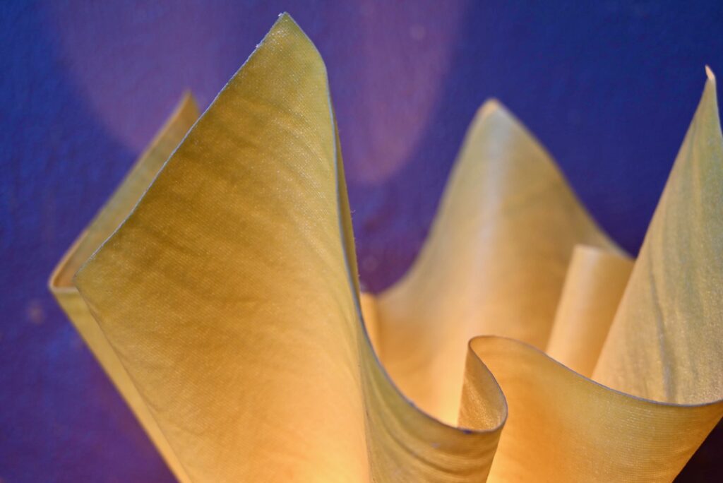 Inspiré de la forme sculpturale d’un drappé, cet exubérant luminaire des années 80 offre un feu d’artifices de forme et de lumière. L’abat-jour est constitué de fibre et résine jaune vif, en volutes et drapés. Le tout repose sur un socle de pierre blanche. Originale, colorée, démonstrative, cette lampe de table participe à l’ambiance et ne laisse personne indifférent!