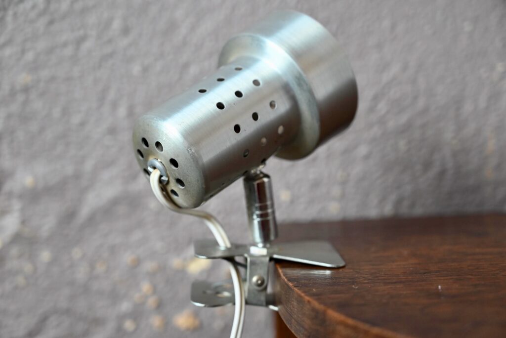 La lampe clip est réalisée métal chromé brossé. L’électrification est d’origine, la lampe est fonctionnelle, quelques traces d’usage sont visibles.