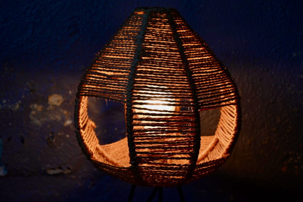 Rare et intéressante, cette lampe à poser est une production des années 50. Dotée d’une ossature en métal, elle repose sur un fin piétement tripode portant une sorte de cocon de corde tendue. Tout en légèreté et en jeux lumineux, cette lampe de table attachante contribuera à l’ambiance chaleureuse d’une pièce de vie.
