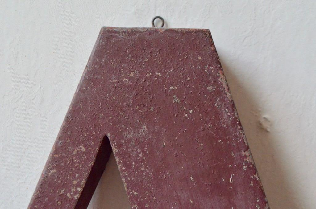 Les lettres sont en zinc, la peinture aubergine est d’origine, mat et patinée. Les lettres sont creuses, il est facile de les accrocher. Nous disposons des lettres A, N, T, U, E, R.