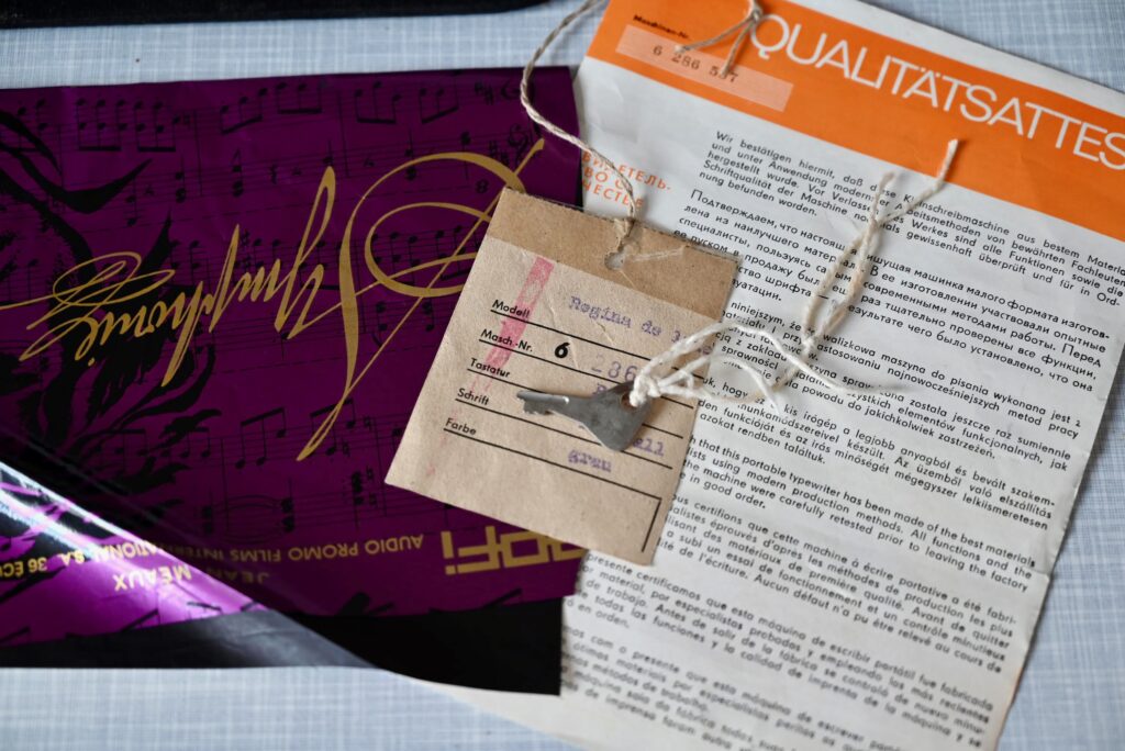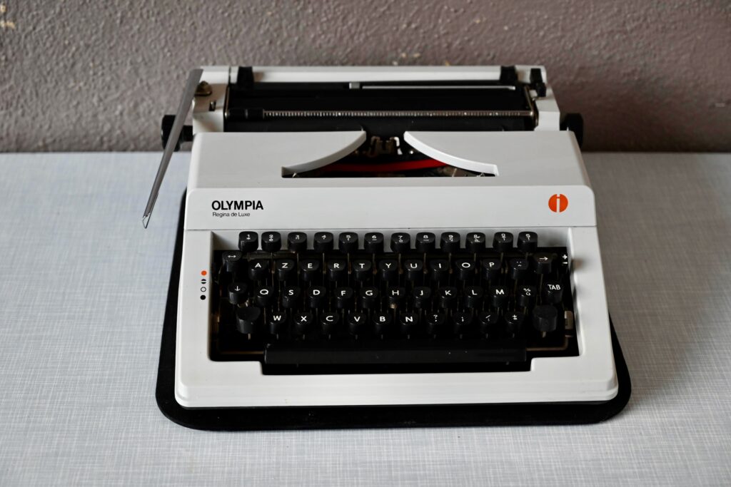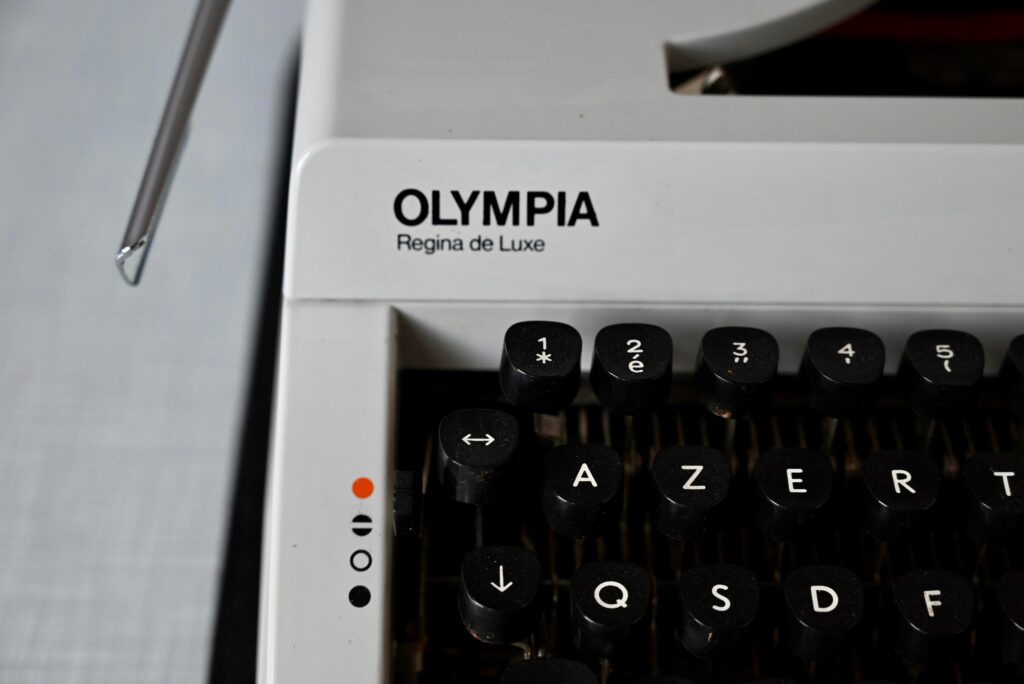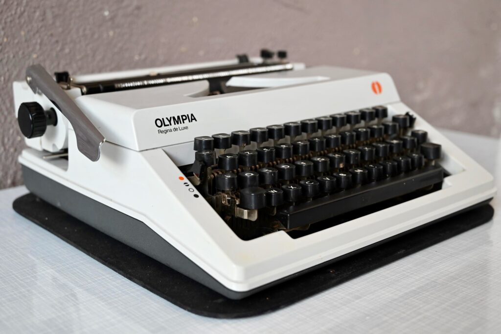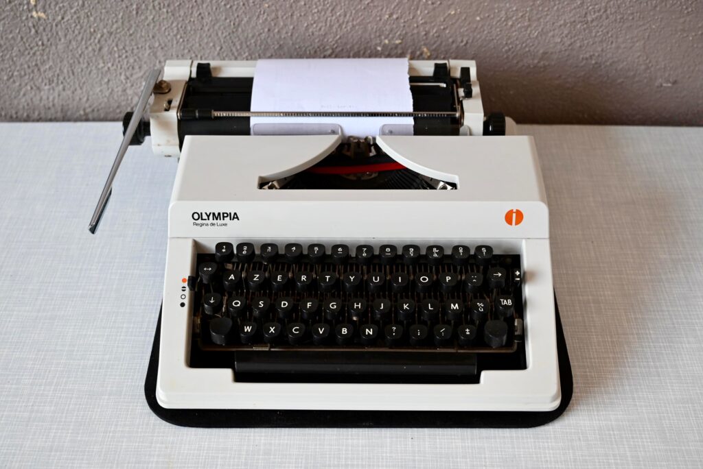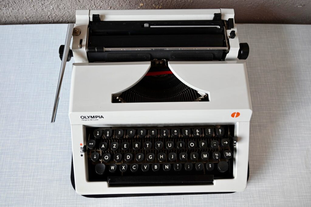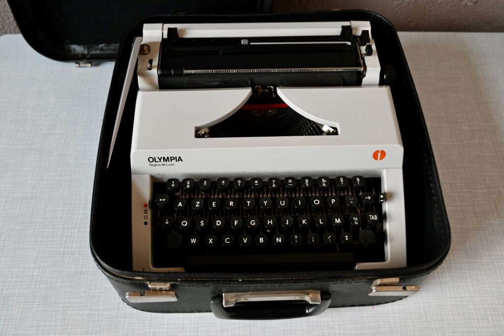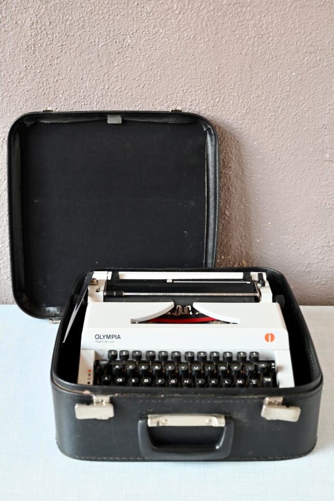 La machine à écrire est en métal blanc. Elle est en très bel état et est fonctionnelle. Le ruban peut être changé par un ruban universel. Ce bel objet de métier est estampillé Olympia Regina de Luxe sur le devant. La valise et sa clef, le feuillet mode d’emploi sont d’origine