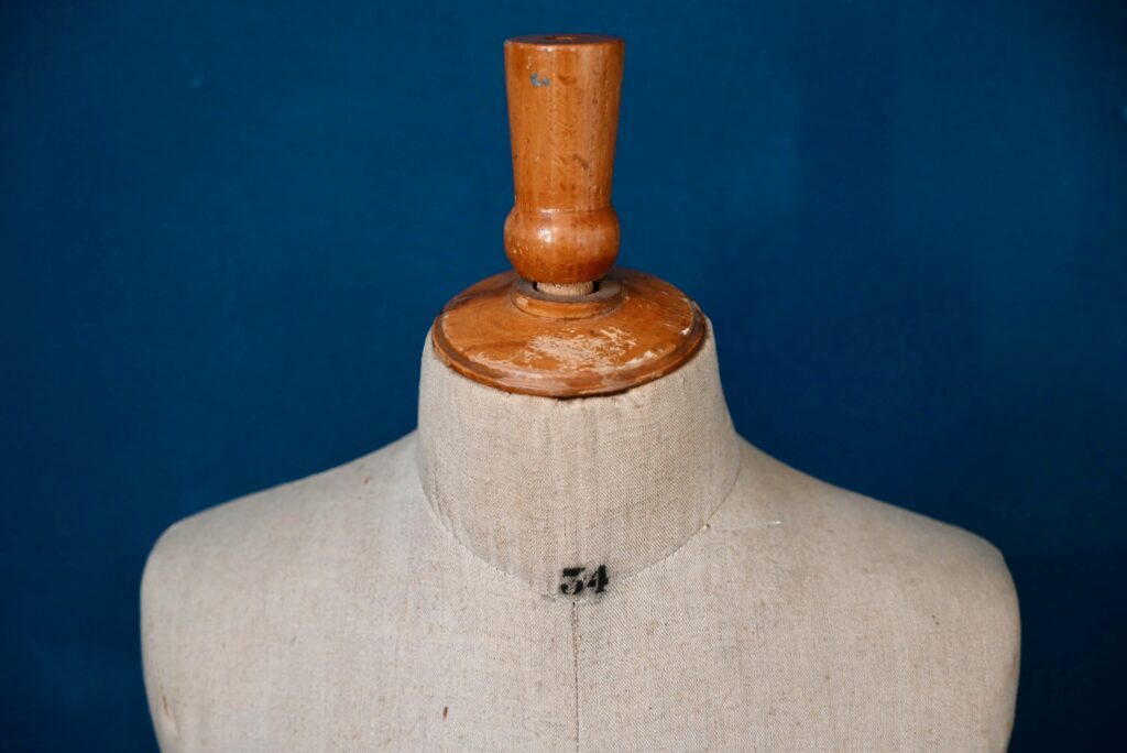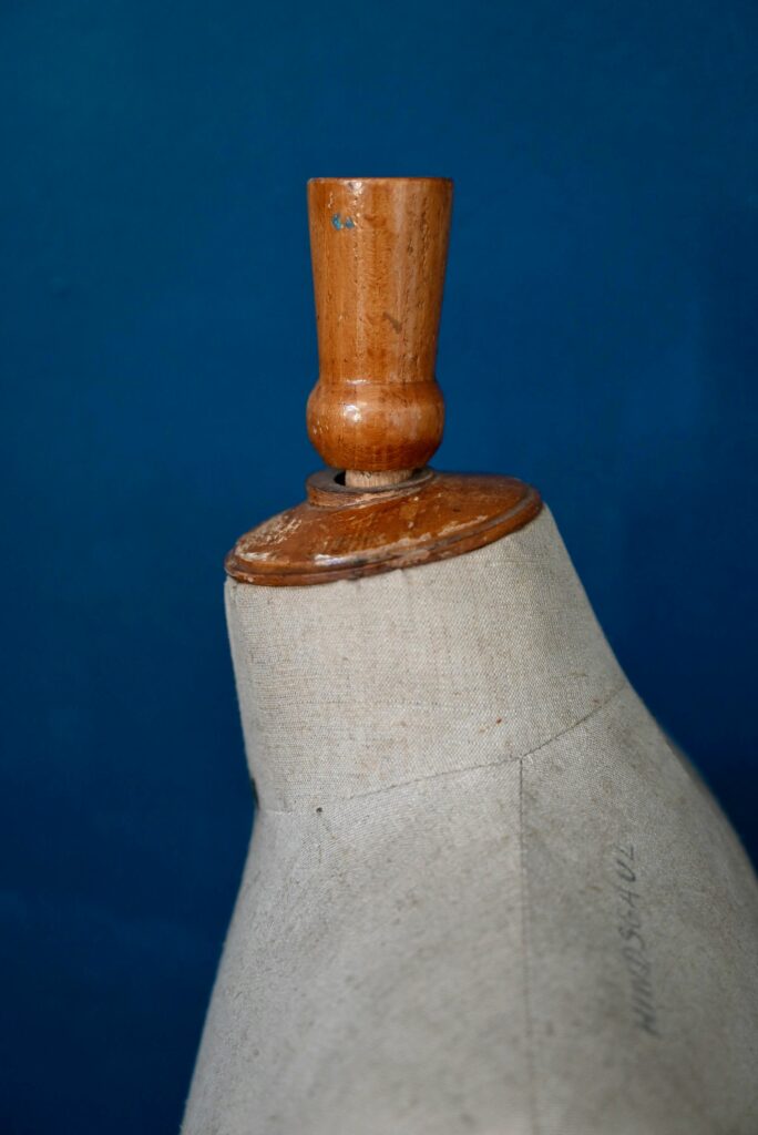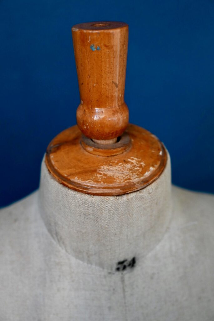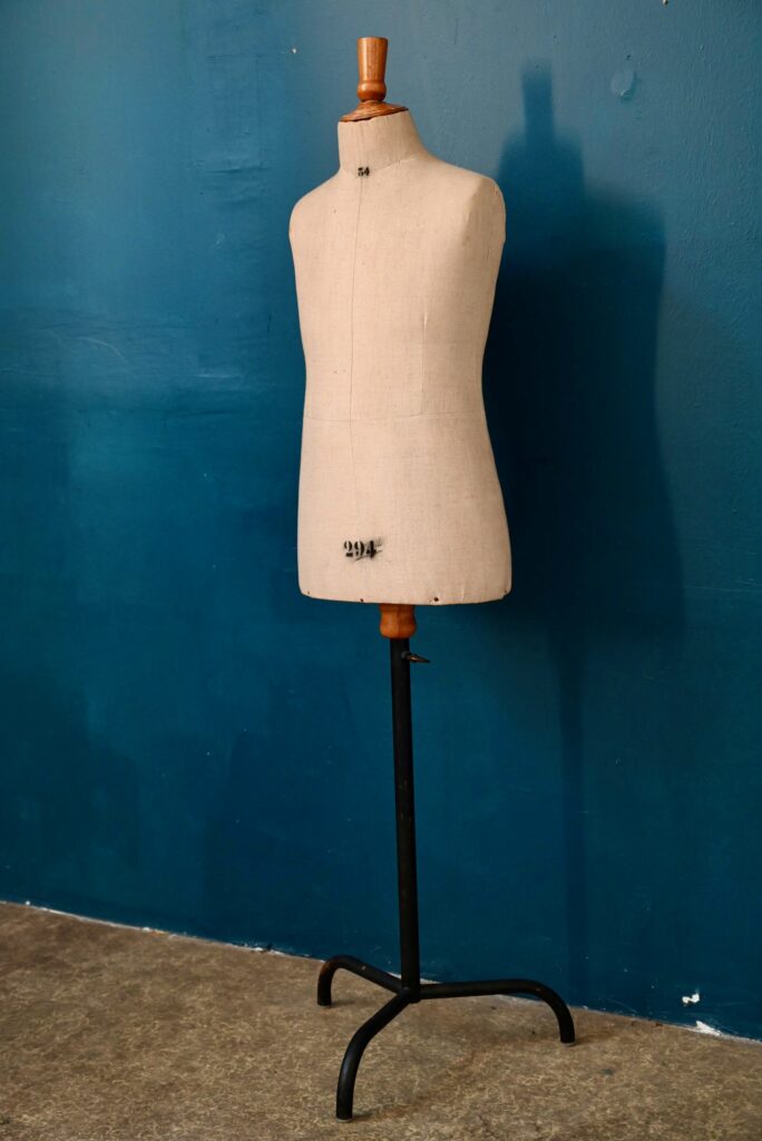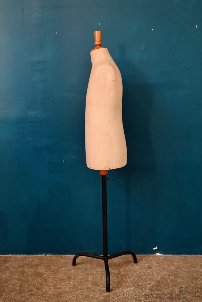 Le mannequin de couture est ancien et nous plonge dans l’univers des années 50 : ateliers de confection, jolies boutiques, passants élégants, toilettes soignées… Avec poésie, ce bel objet témoigne du travail des couturières et de la mode. Ce buste d’enfant ou jeune homme s’est fait épingler à multiples reprises. Enveloppé d’étoffes, on y taillait sur-mesure chemises et costumes en évitant les faux-plis. Aujourd’hui, le prêt-à-porter a quelque peu perdu de sa poésie, mais ce buste monté sur un piétement en métal tubulaire continue d’évoquer avec douceur cette période révolue… Dans la vitrine d’une boutique ou dans une chambre, ce mannequin viendra suspendre le temps.