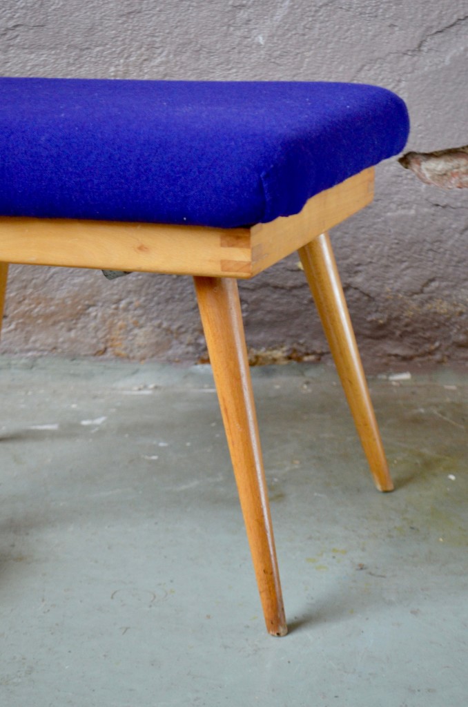 L’assise du tabouret peut se soulever pour laisser apparaître deux marches. Il est très stable, solide, bien construit. L’assise est recouverte d’un tissu dans un joli bleu. Le tout est en très bel état et parfaitement fonctionnel.