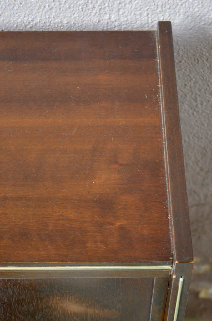 Le meuble est ancien et date des années 60. Il est de belle facture et d’une belle teinte foncée. Un liseré doré et des boutons en laiton doré rehausse la teinte. Le caisson est monté sur de jolis pieds compas. Les portes coulissent facilement, quelques marques d’usage très discrètes sont présentes sur le plateau. Le meuble est en bel état.
