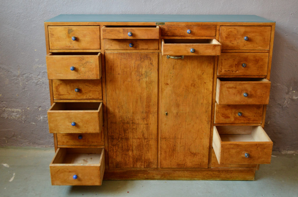 Le meuble est ancien et date des années 40. Il est en bois et placage bois d’une belle teinte miel. Il comporte plusieurs tiroirs dont les boutons en bois tourné ont été peints par un des précédents propriétaires ; le meuble oeuvrait dans une école avant son arrivée à l’Atelier. Il comporte également deux portes battantes fermant un caisson à étagères. Le placage des portes a un peu gonflé, sans que cela nuise à l’ouverture des portes. Le plateau a été repeint bleu orage. La patine est superbe, l’ensemble montre des marques d’usage profondes qui participent au charme de ce grand meuble midcentury.