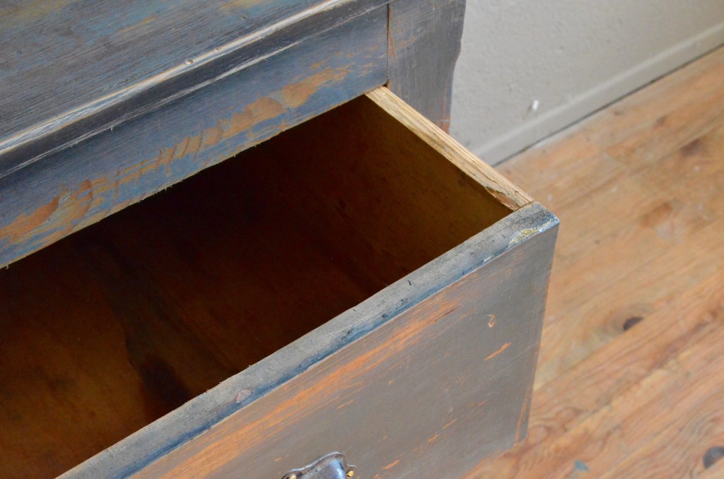 Le meuble est en bois massif. Les assemblages en queue d’aronde témoignent d’un meuble ancien et de belle facture. Les poignées coquilles sont d’origine. La patine est intense et profonde, gris ardoise-bleu sombre-noir. Les tiroirs sont hauts et profonds et permettent beaucoup de rangement. Le meuble est en très bel état.