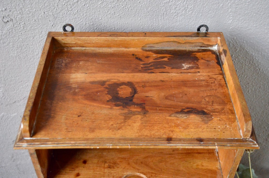 Le meuble colonne est en bois massif. Sa teinte profonde, sa patine et son lustre sont touchants d’authenticité. Il dispose de compartiments de rangement permettant le tri de courrier ou de documents. Son plateau est bordé d’un rebord sur 3 côtés. Une corniche ciselé souligne les lignes douces du meuble. Le meuble est en bel état, sa patine est belle. Des taches d’encre sont présentes sur le plateau, visibles sur les photos. Il peut être posé, ou fixé au mur grâce à des pattes de fixation prévues à cet effet.