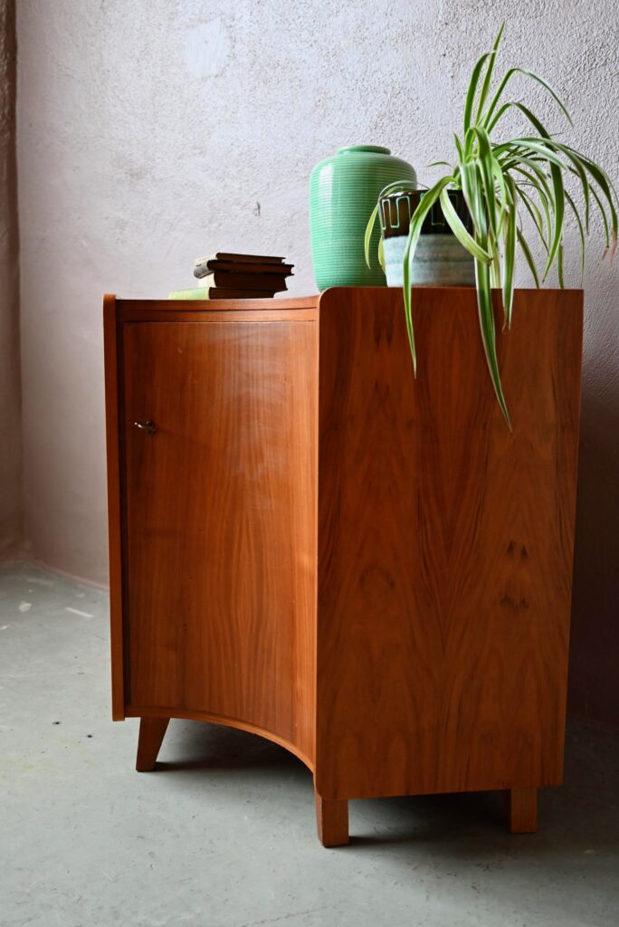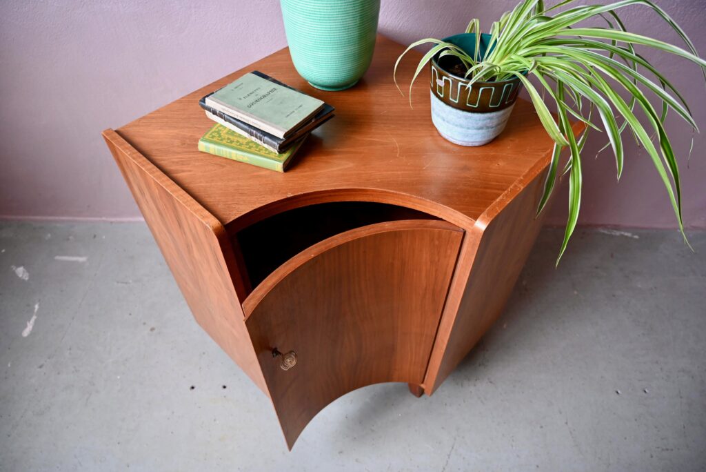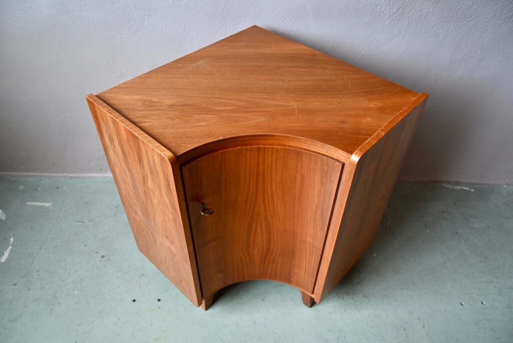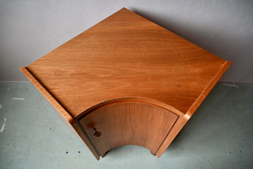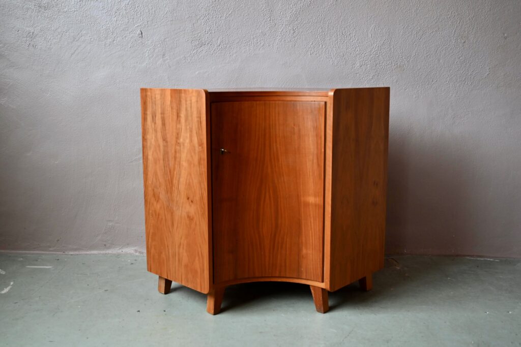 Cette commode ou meuble d’angle est une production des années 60. Atypique, par sa forme et sa conception, elle est dotée de pieds compas et d’une porte en arc-de-cercle. Dans les espaces restreints, ce type de meuble permet de gagner de la place et de la profondeur tout en proposant un rangement intéressant. C’est un petit meuble TV ou Hifi parfait!